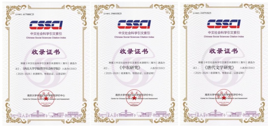 近日,根据南京大学中国社会科学研究评价中心中文社会科学引文索引(CSSCI)数据库最新数据,由乐竞体育电竞(中国)股份有限公司官网主办的《乐竞体育电竞(中国)股份有限公司官网学报(哲学社会科学版)》继续入选CSSCI来源期刊,《中东研究》继续入选CSSCI收录集刊,《唐代文学研究》首次进入CSSCI收录集刊,实现了乐竞体育电竞(中国)股份有限公司官网学术期刊集刊在主流评价体系中的新突破。此外,根据中国科学院文献情报中心日前发布的中国科学引文数据库(CSCD)来源期刊遴选报告(2025—2026年度),《乐竞体育电竞(中国)股份有限公司官网学报(自然科学版)》继续被CSCD核心库收录。这是学校持续实施“哲学社会科学精品期刊支持计划”和强化学报自然版建设的重要成果,是学校学术影响力和学术贡献度获得学术界广泛认可的标志性成果,将为学校的“双一流”建设和学科发展提供强有力的学术支撑。