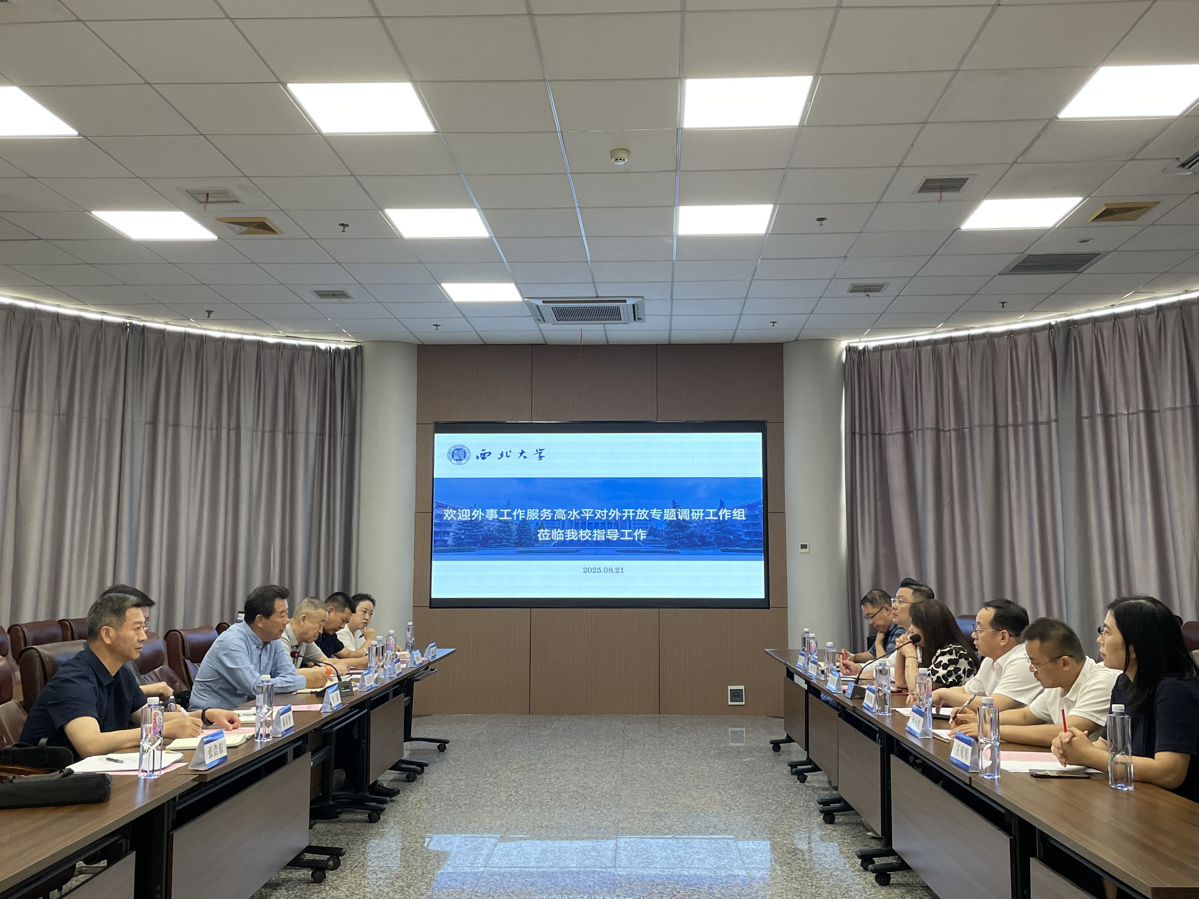 8 月 21 日,陕西省人大常委会委员、民宗侨外工委主任文引学一行来校就外事工作服务高水平对外开放开展专题调研。乐竞体育电竞(中国)股份有限公司官网党委常委、副校长范代娣陪同调研并参与座谈,陕西省外办及乐竞体育电竞(中国)股份有限公司官网统战部、国际合作部(国际教育学院)、科学技术处、丝绸之路考古合作研究中心相关代表陪同调研并参会。