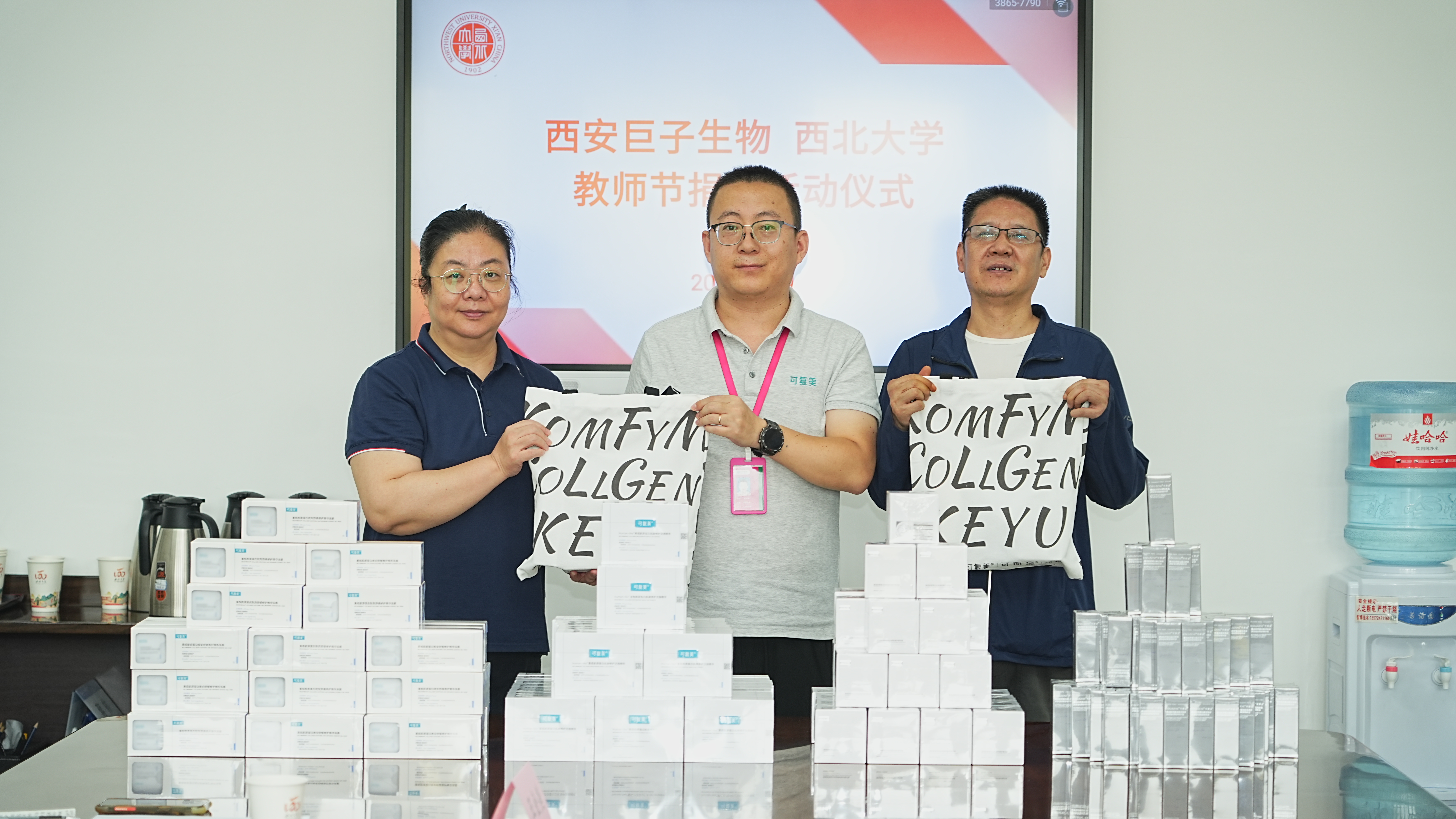 9月9日上午,在第41个教师节来临之际,乐竞体育电竞(中国)股份有限公司官网校友企业向学校捐赠可复美、可丽金系列产品,为学校全体教育工作者送来节日祝福与问候。校党委常委、副校长李振海,西安巨子生物基因技术股份有限公司首席财务官张慧娟,西安高新巨子医疗美容诊所院长王艳,西安巨子生物基因技术股份有限公司人事行政主管霍宝玉,国内处、校工会、离退休处负责人参加仪式。