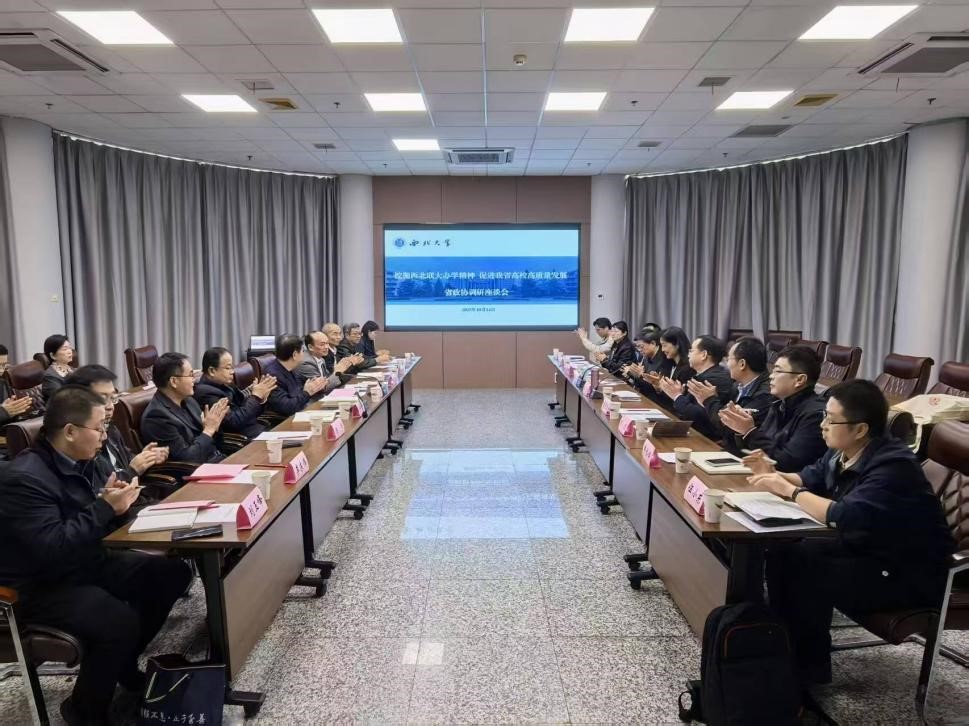 10月14日,省政协教育科技委员会主任薛建兴一行来校,就“挖掘西北联大精神,促进我省高校高质量发展”进行专题调研并座谈。校党委副书记张清,党委常委、统战部部长董国强,省政协教育科技委员会、省教育厅有关负责同志以及部分省政协委员、兄弟高校专家,乐竞体育电竞(中国)股份有限公司官网相关部门同志、西北联大研究专家陪同调研并参加座谈交流。