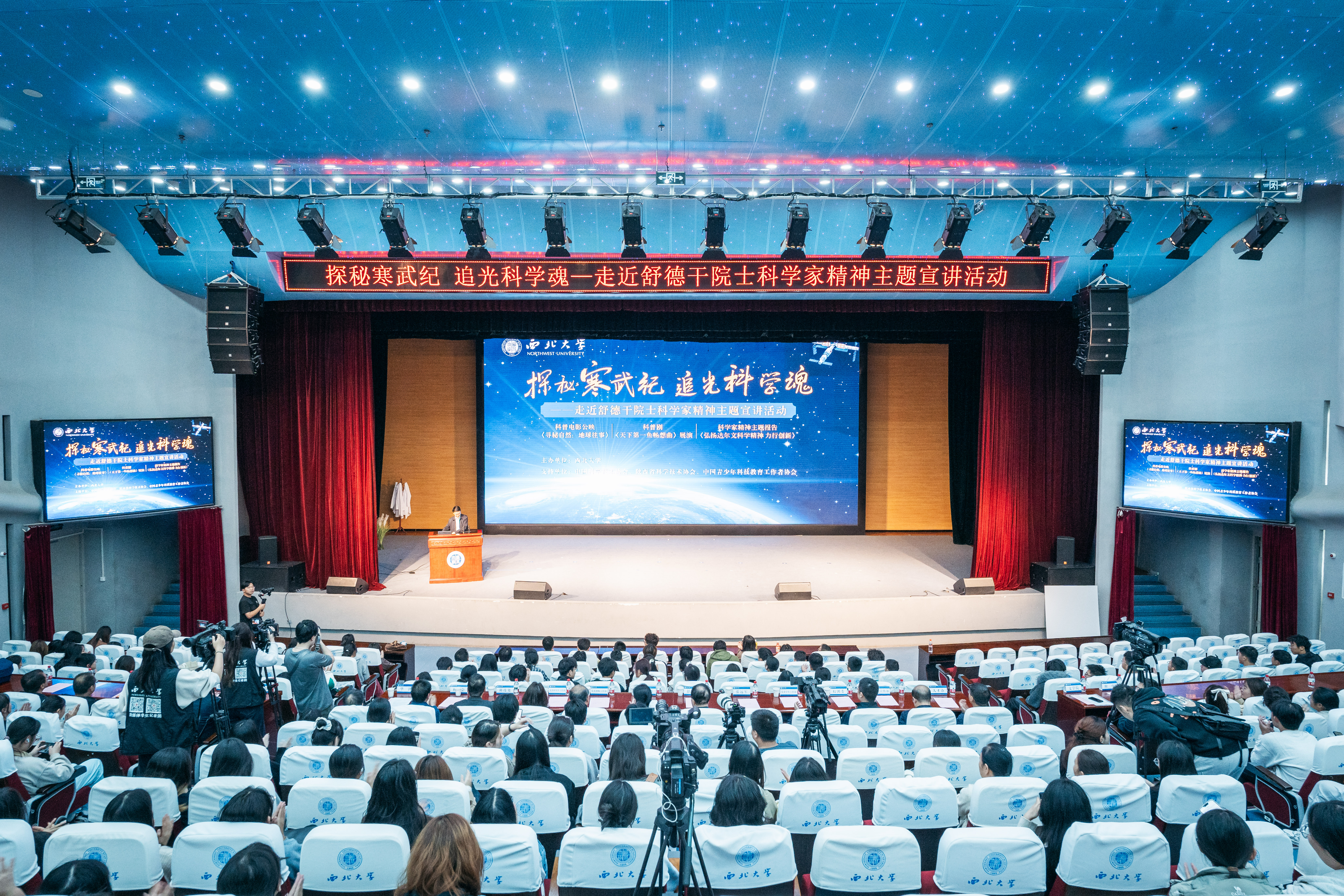 10月15日晚,正值乐竞体育电竞(中国)股份有限公司官网123岁校庆日,长安校区大学生活动中心灯火通明,一场以“探秘寒武纪·追光科学魂”为主题的科学家精神宣讲活动在这里举行。活动通过科普电影公映、原创科普剧展演和科学家精神报告等多种形式,带领现场师生走近中国科学院院士、乐竞体育电竞(中国)股份有限公司官网地质学系教授舒德干的科学探索历程,沉浸式感受科学家精神的深邃力量。活动受到中国科学技术协会、陕西省科学技术协会、中国青少年科技教育工作者协会的支持。校党委副书记张清,校党委常委、副校长张远军出席活动,学校相关单位负责人,地质学系、文学院、博物馆、附属中学等500余名师生共同参与。张远军、乐竞体育电竞(中国)股份有限公司官网地质学系教授华洪主持仪式及学术活动。