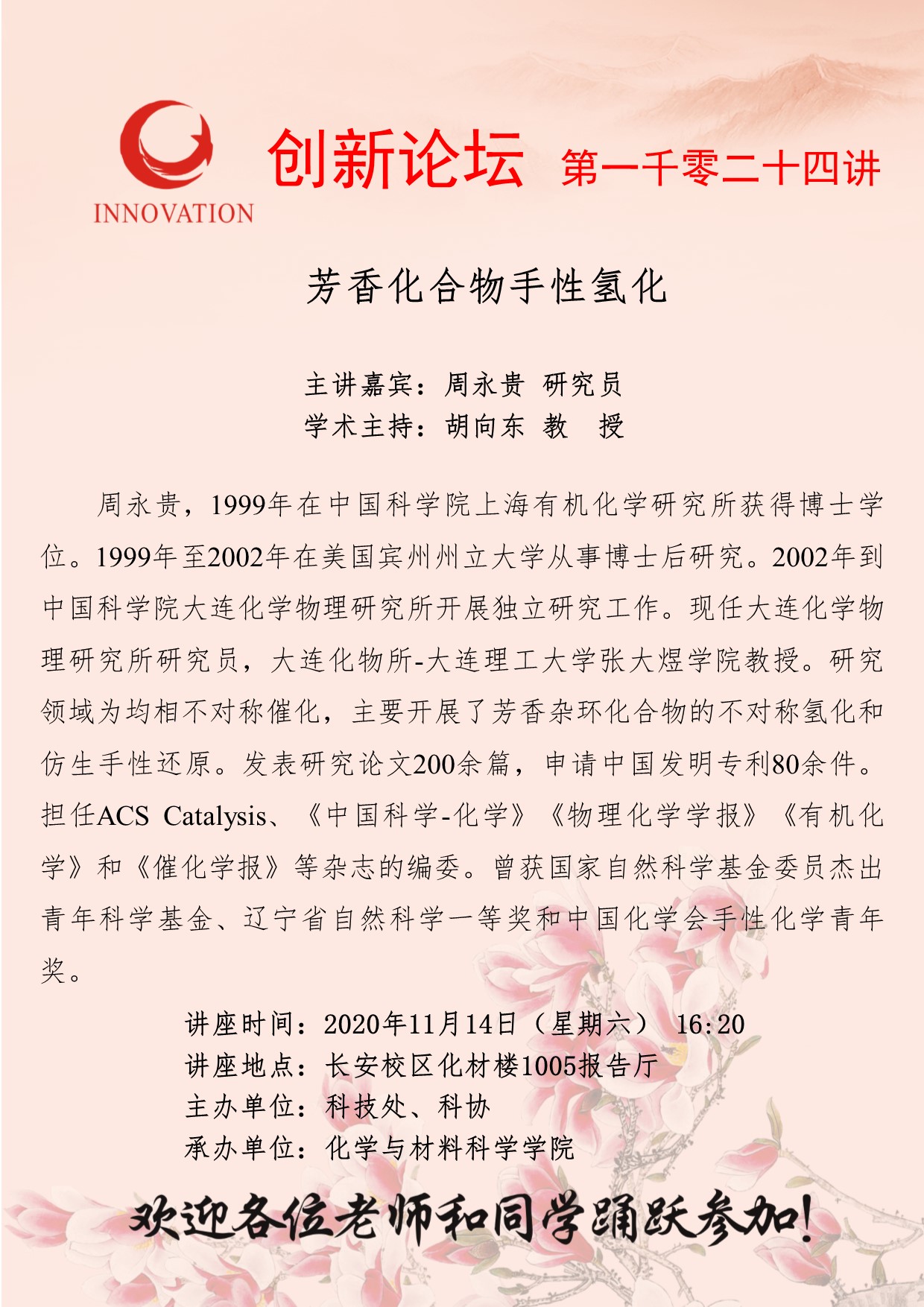 周永贵 研究员 乐竞体育电竞(中国)股份有限公司官网创新论坛第一千零二十四讲:芳香化合物手性氢化 讲座时间 2020年11月14日(周六)16:20 讲座地点 长安校区化材楼1005报告厅 讲座人介绍 周永贵 研究员 讲座内容