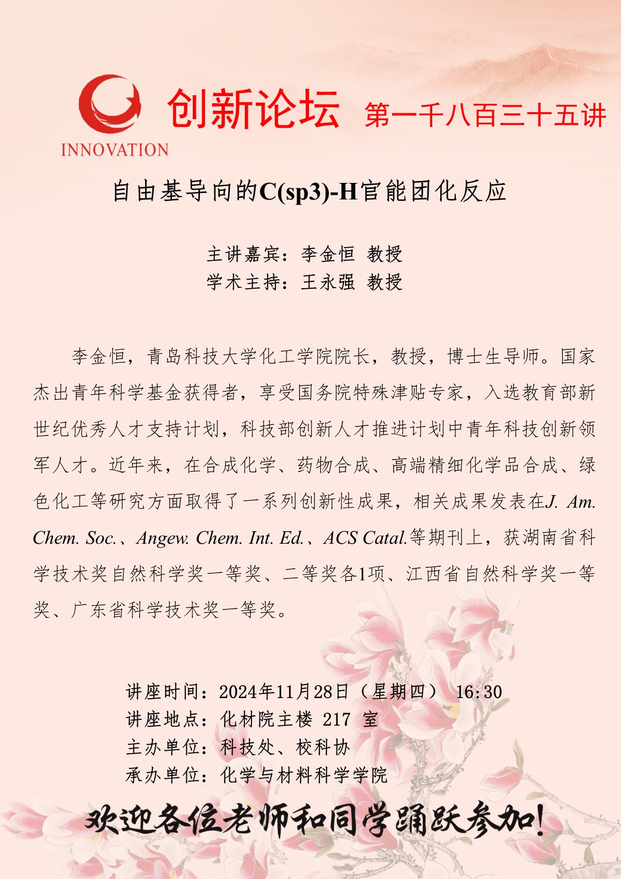 李金恒 教授 乐竞体育电竞(中国)股份有限公司官网创新论坛第一千八百三十五讲:自由基导向的C(sp3)-H官能团化反应 讲座时间 2024年11月28日(星期四) 16:30 讲座地点 化材院主楼217室 讲座人介绍 李金恒 教授 讲座内容