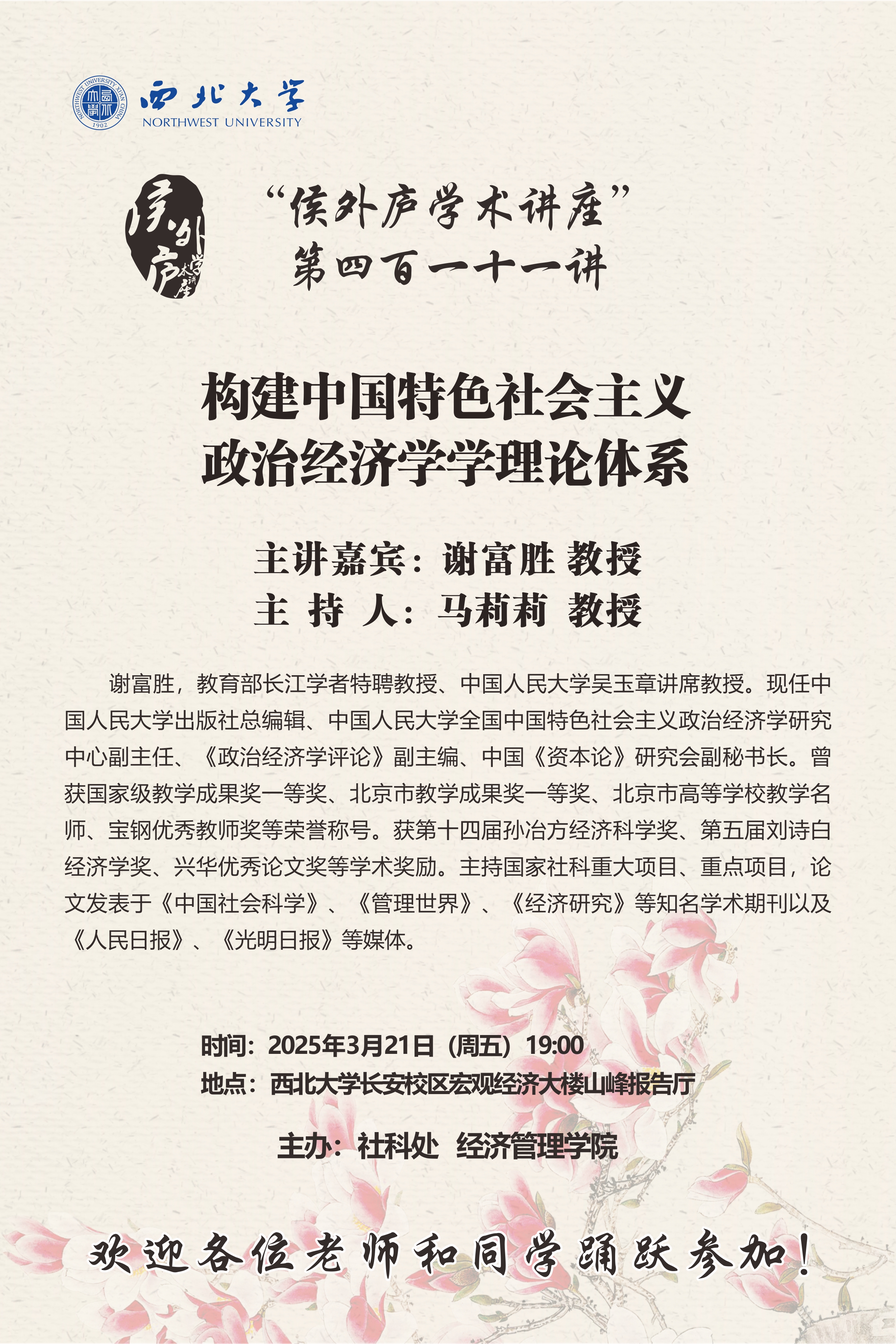 谢富胜 教授 “侯外庐学术讲座”第四百一十一讲:构建中国特色社会主义政治经济学理论体系 讲座时间 2025年3月21日(周五)19:00 讲座地点 乐竞体育电竞(中国)股份有限公司官网长安校区宏观经济大楼山峰报告厅 讲座人介绍 谢富胜 教授 讲座内容