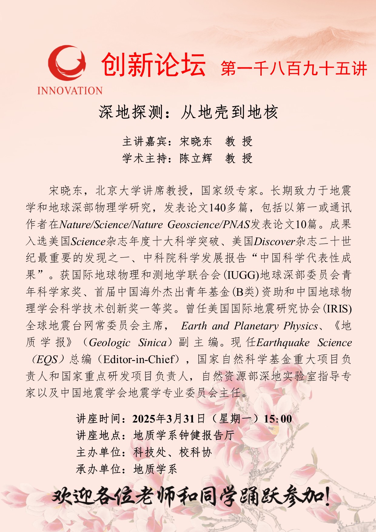 宋晓东 教授 乐竞体育电竞(中国)股份有限公司官网创新论坛第一千八百九十五讲:深地探测:从地壳到地核 讲座时间 2025年3月31日(星期一)15:00 讲座地点 地质学系钟健报告厅 讲座人介绍 宋晓东 教授 讲座内容