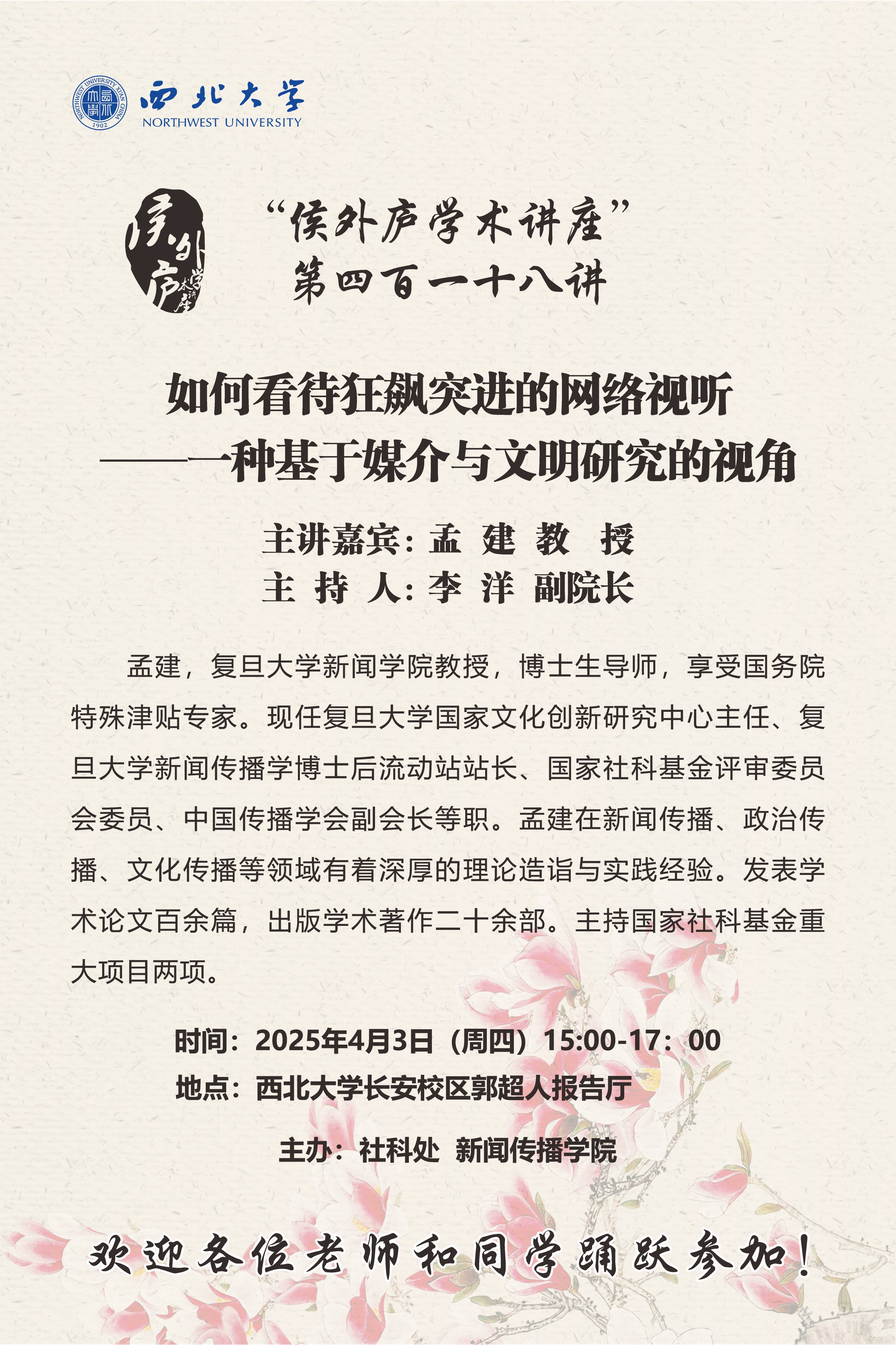 孟建 教授 “侯外庐学术讲座”第四百一十八讲:如何看待狂飙突进的网络视听——一种基于媒介与文明研究的视角 讲座时间 2025年4月3日(周四)15:00-17:00 讲座地点 乐竞体育电竞(中国)股份有限公司官网长安校区郭超人报告厅 讲座人介绍 孟建 教授 讲座内容