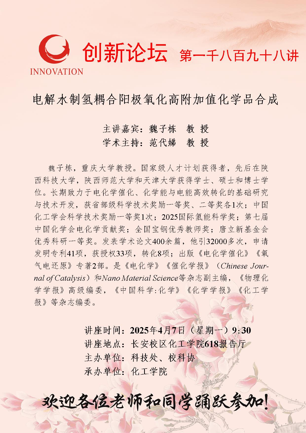 魏子栋 教授 乐竞体育电竞(中国)股份有限公司官网创新论坛第一千八百九十八讲:电解水制氢耦合阳极氧化高附加值化学品合成 讲座时间 2025年4月7日(星期一)9:30 讲座地点 长安校区化工学院618报告厅 讲座人介绍 魏子栋 教授 讲座内容