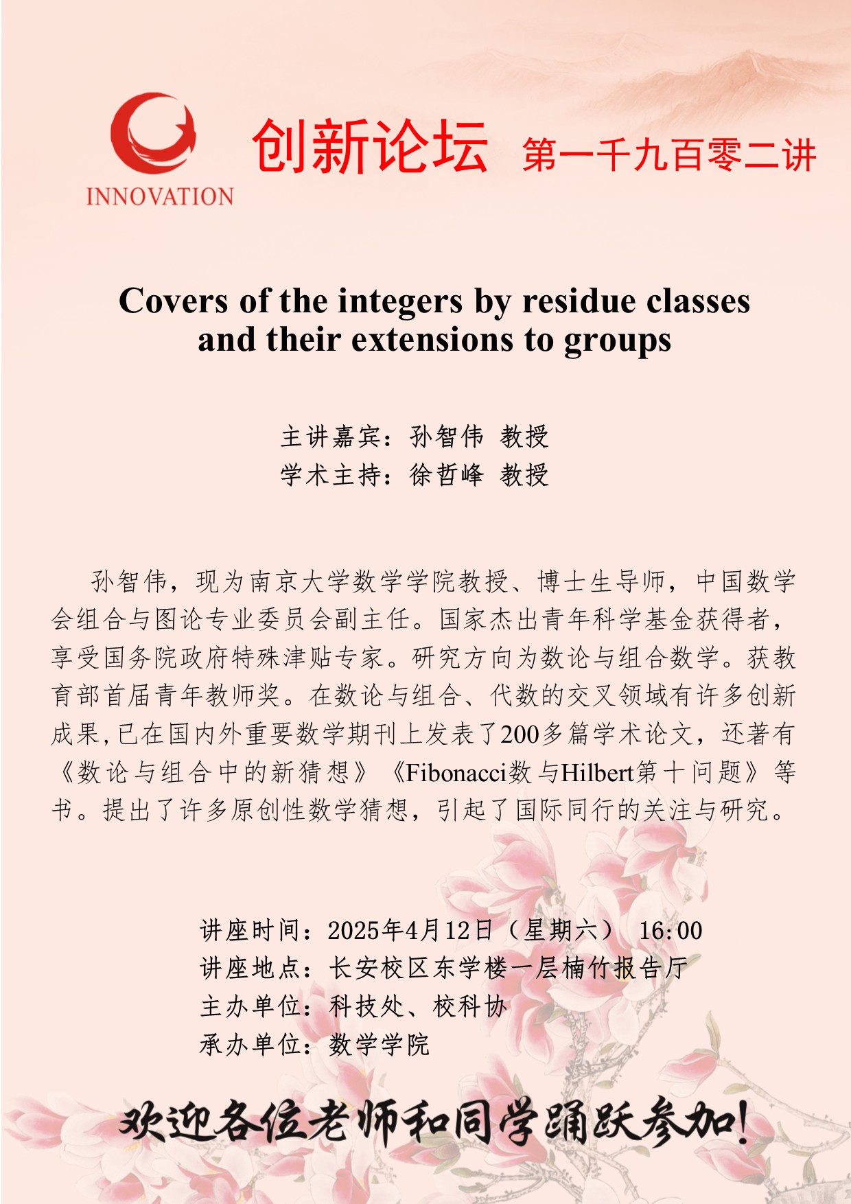 孙智伟 教授 乐竞体育电竞(中国)股份有限公司官网创新论坛第一千九百零二讲:Covers of the integers by residue classes and their extensions to groups 讲座时间 2025年4月12日(星期六) 16:00 讲座地点 长安校区东学楼一层楠竹报告厅 讲座人介绍 孙智伟 教授 讲座内容