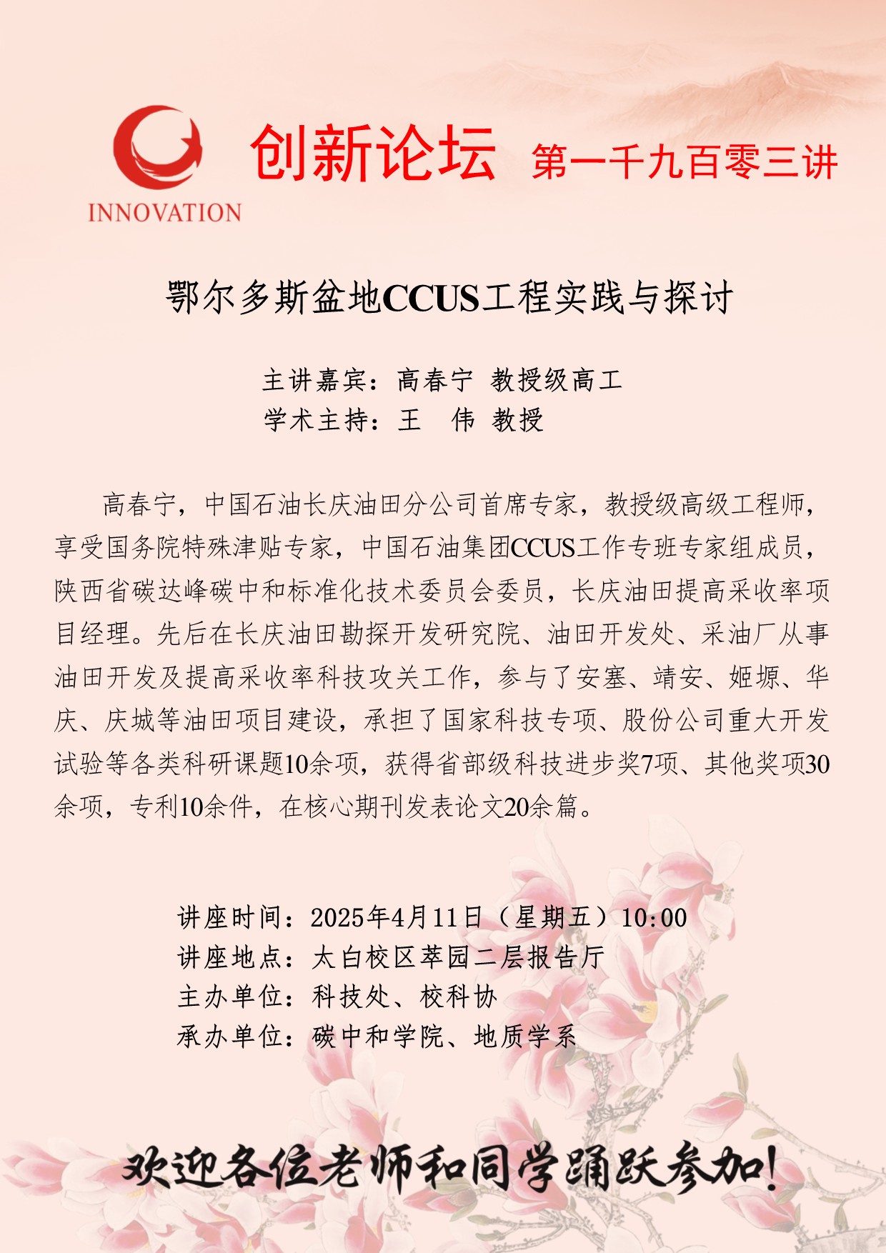 高春宁 教授级高工 乐竞体育电竞(中国)股份有限公司官网创新论坛第一千九百零三讲:鄂尔多斯盆地CCUS工程实践与探讨 讲座时间 2025年4月11日(星期五)10:00 讲座地点 太白校区萃园二层报告厅 讲座人介绍 高春宁 教授级高工 讲座内容