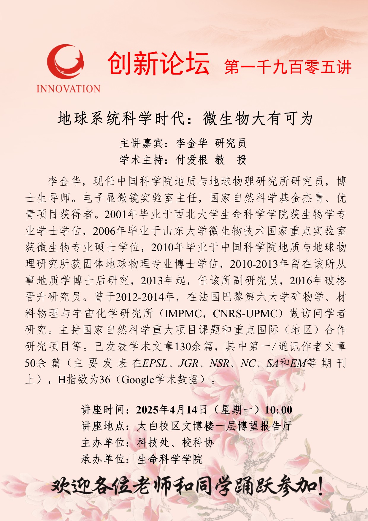 李金华 研究员 乐竞体育电竞(中国)股份有限公司官网创新论坛第一千九百零五讲:地球系统科学时代:微生物大有可为 讲座时间 2025年4月14日(星期一)10:00 讲座地点 太白校区文博楼一层博望报告厅 讲座人介绍 李金华 研究员 讲座内容