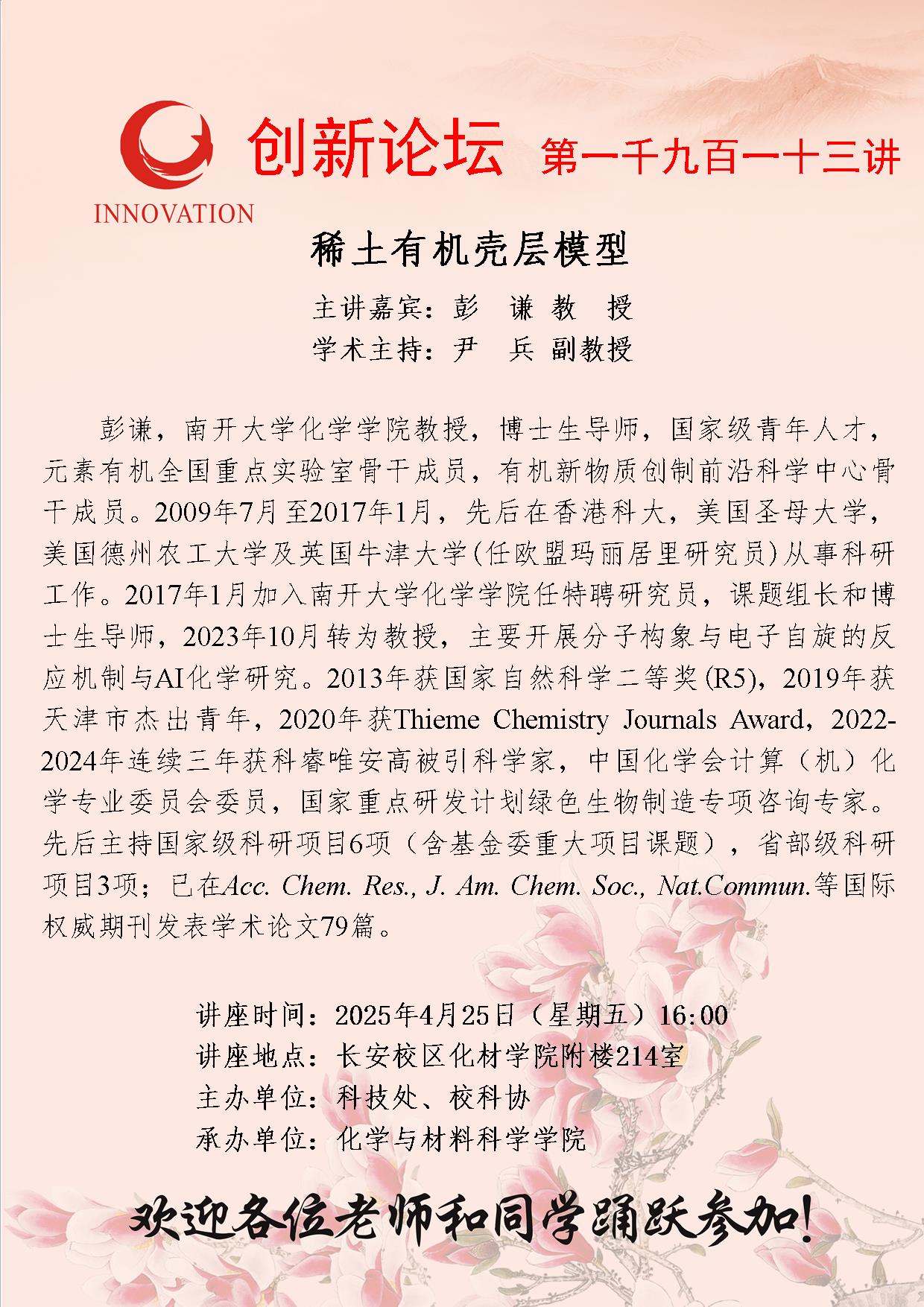 彭谦 教授 乐竞体育电竞(中国)股份有限公司官网创新论坛第一千九百一十三讲:稀土有机壳层模型 讲座时间 2025年4月25日(星期五)16:00 讲座地点 长安校区化材学院附楼214室 讲座人介绍 彭谦 教授 讲座内容