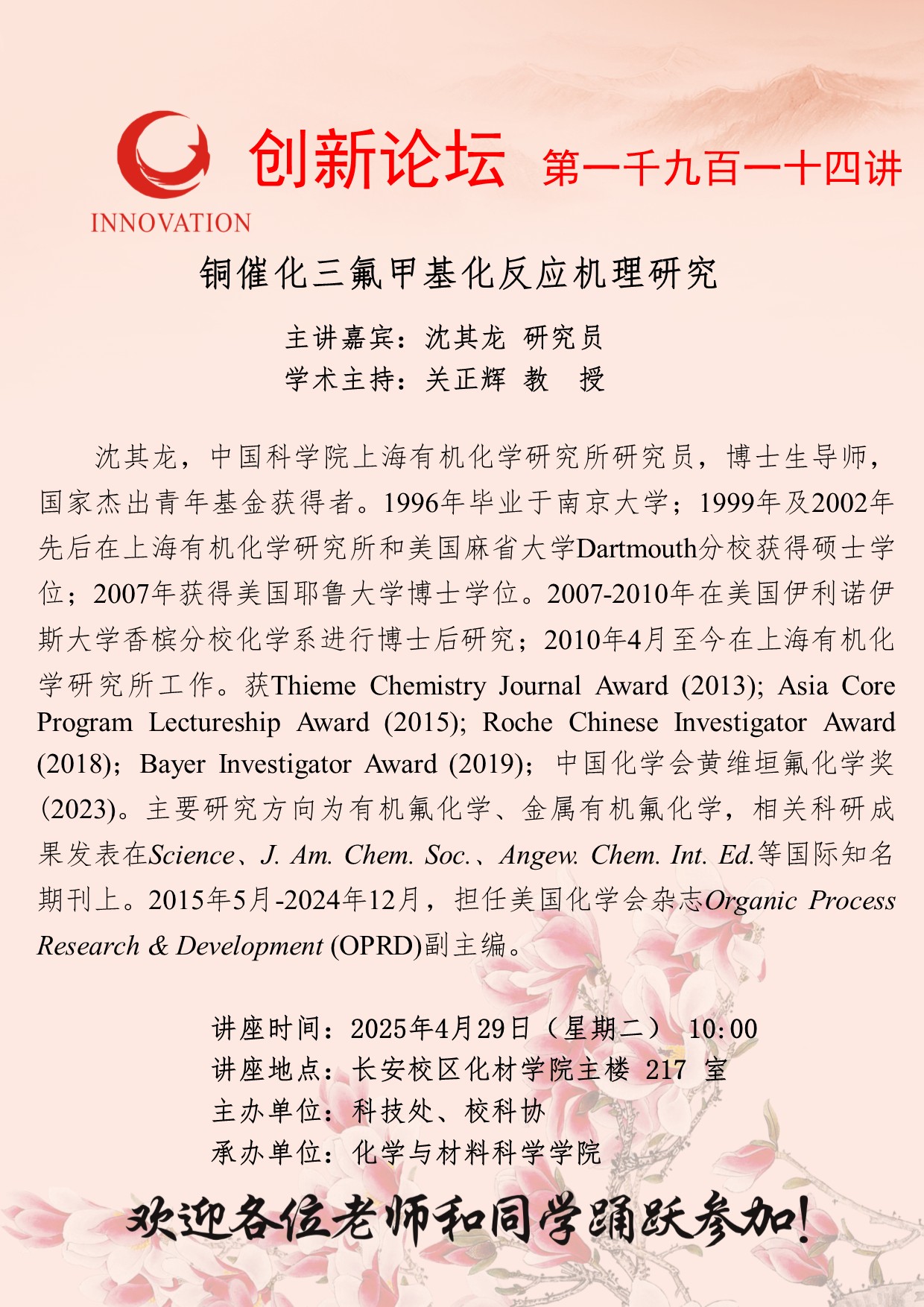 沈其龙 研究员 乐竞体育电竞(中国)股份有限公司官网创新论坛第一千九百一十四讲:铜催化三氟甲基化反应机理研究 讲座时间 2025年4月29日(星期二) 10:00 讲座地点 长安校区化材学院主楼 217 室 讲座人介绍 沈其龙 研究员 讲座内容