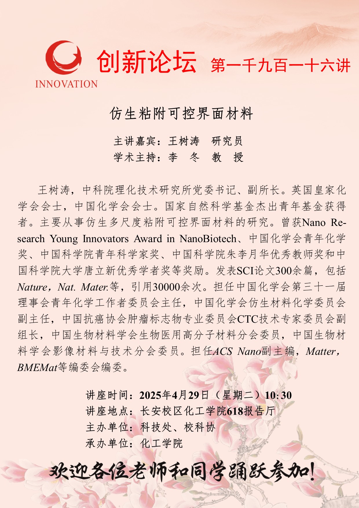 王树涛 研究员 乐竞体育电竞(中国)股份有限公司官网创新论坛第一千九百一十六讲:仿生粘附可控界面材料 讲座时间 2025年4月29日(星期二)10:30 讲座地点 长安校区化工学院618报告厅 讲座人介绍 王树涛 研究员 讲座内容