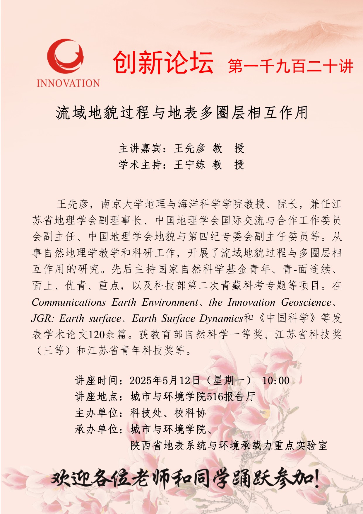 王先彦 教授 乐竞体育电竞(中国)股份有限公司官网创新论坛第一千九百二十讲:流域地貌过程与地表多圈层相互作用 讲座时间 2025年5月12日(星期一) 10:00 讲座地点 城市与环境学院516报告厅 讲座人介绍 王先彦 教授 讲座内容
