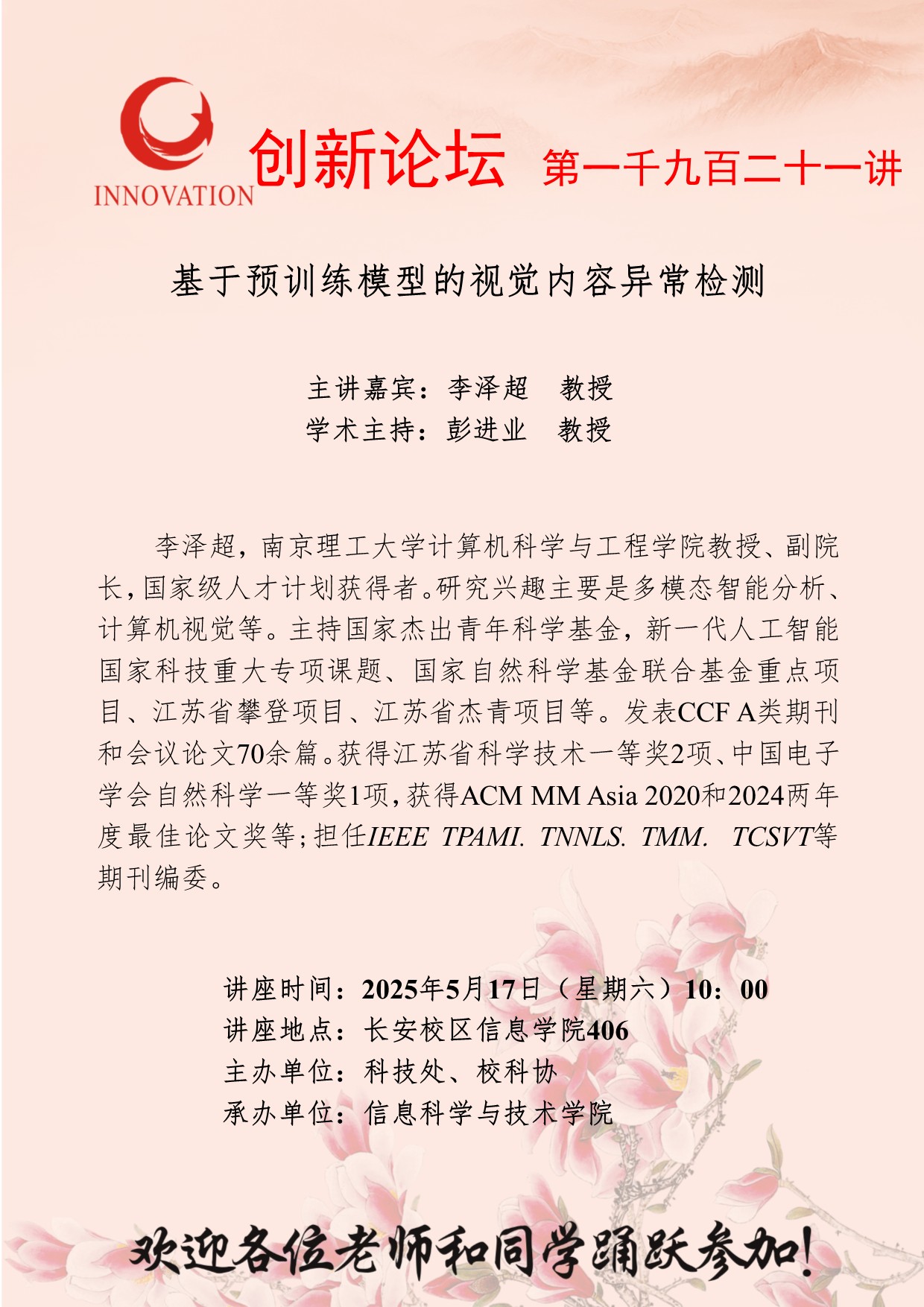 李泽超 教授 乐竞体育电竞(中国)股份有限公司官网创新论坛第一千九百二十一讲:基于预训练模型的视觉内容异常检测 讲座时间 2025年5月17日(星期六)10:00 讲座地点 长安校区信息学院406 讲座人介绍 李泽超 教授 讲座内容