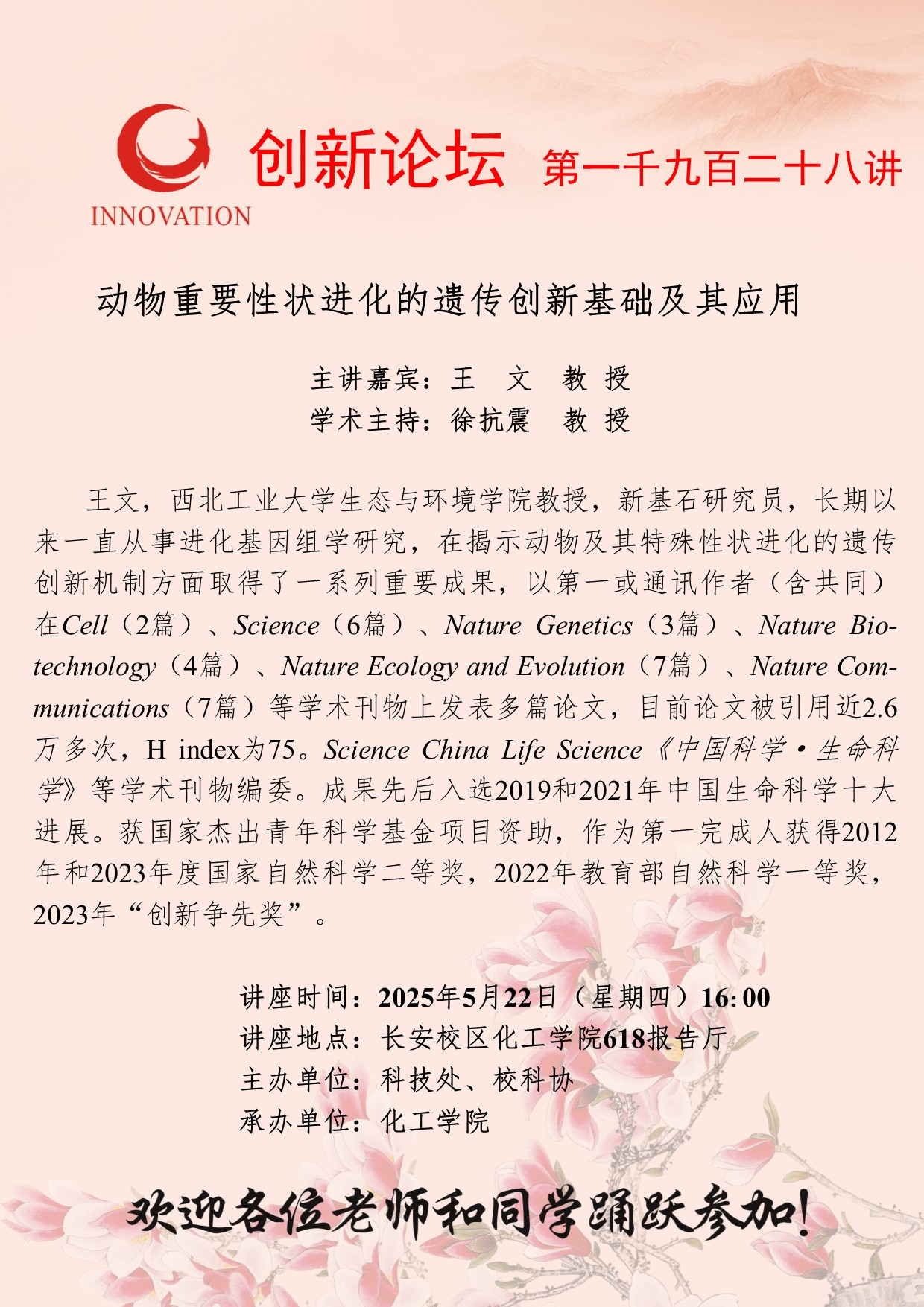 王文 教授 乐竞体育电竞(中国)股份有限公司官网创新论坛第一千九百二十八讲:动物重要性状进化的遗传创新基础及其应用 讲座时间 2025年5月22日(星期四)16:00 讲座地点 长安校区化工学院618报告厅 讲座人介绍 王文 教授 讲座内容