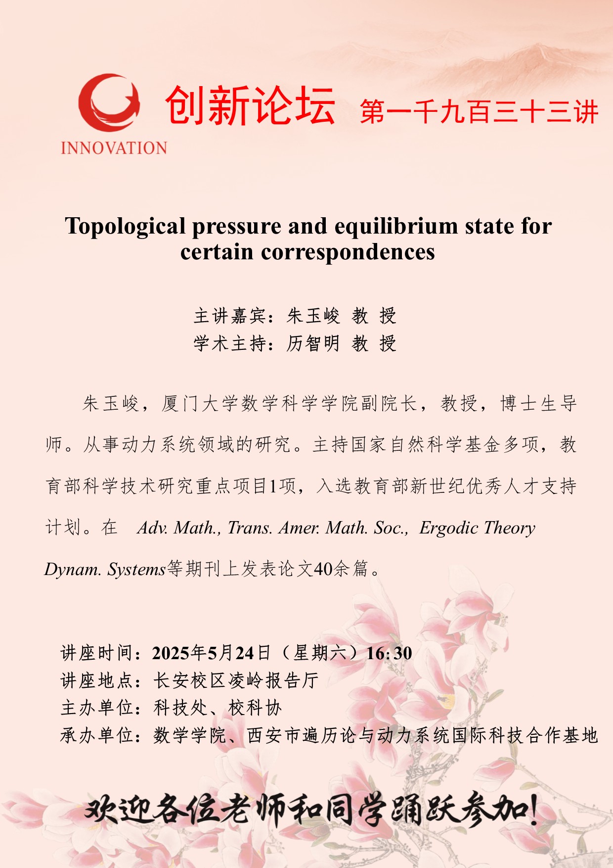朱玉峻 教授 乐竞体育电竞(中国)股份有限公司官网创新论坛第一千九百三十三讲:Topological pressure and equilibrium state for certain correspondences 讲座时间 2025年5月24日(星期六)16:30 讲座地点 长安校区凌岭报告厅 讲座人介绍 朱玉峻 教授 讲座内容