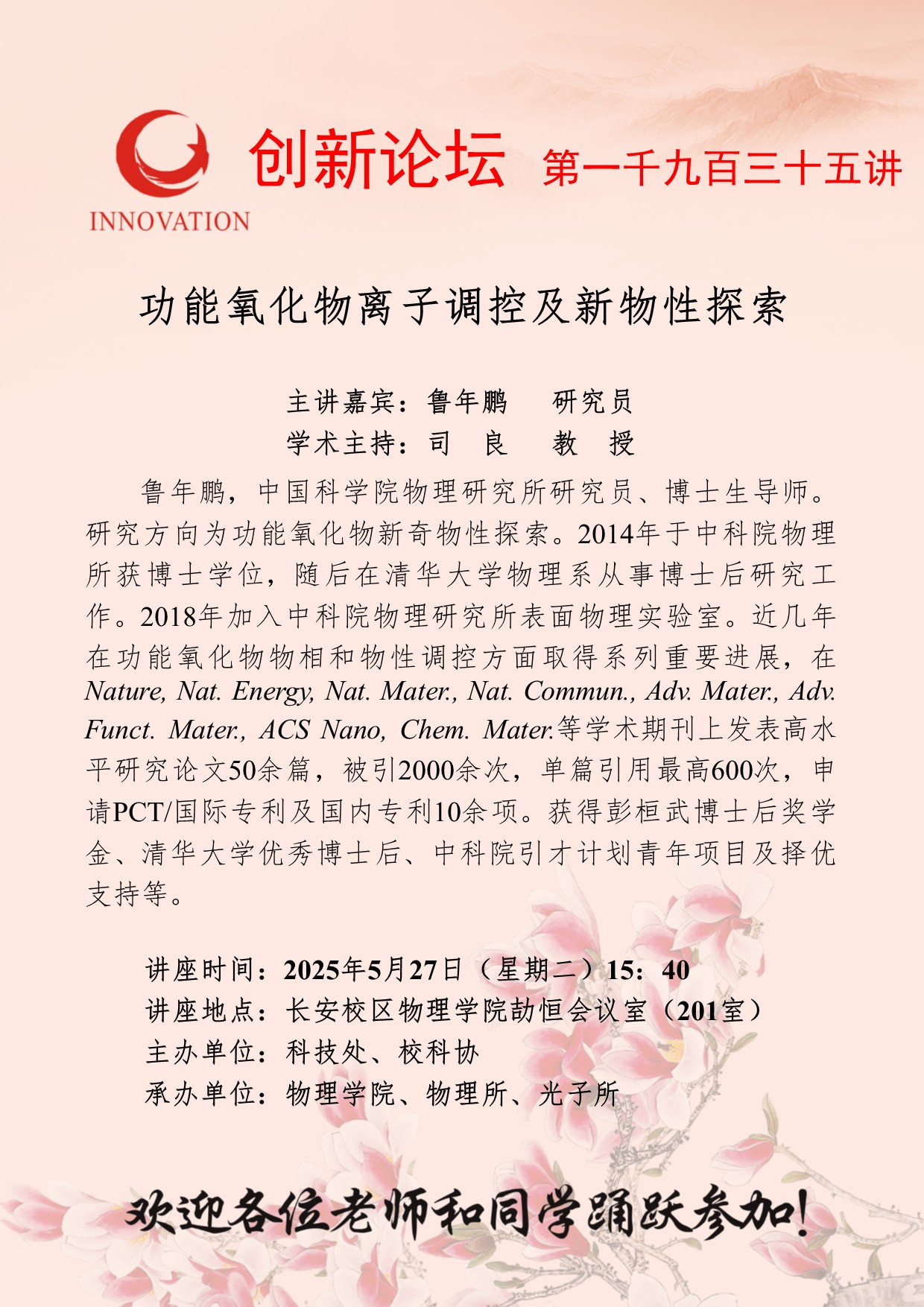 鲁年鹏 研究员 乐竞体育电竞(中国)股份有限公司官网创新论坛第一千九百三十五讲:功能氧化物离子调控及新物性探索 讲座时间 2025年5月27日(星期二)15:40 讲座地点 长安校区物理学院劼恒会议室(201室) 讲座人介绍 鲁年鹏 研究员 讲座内容