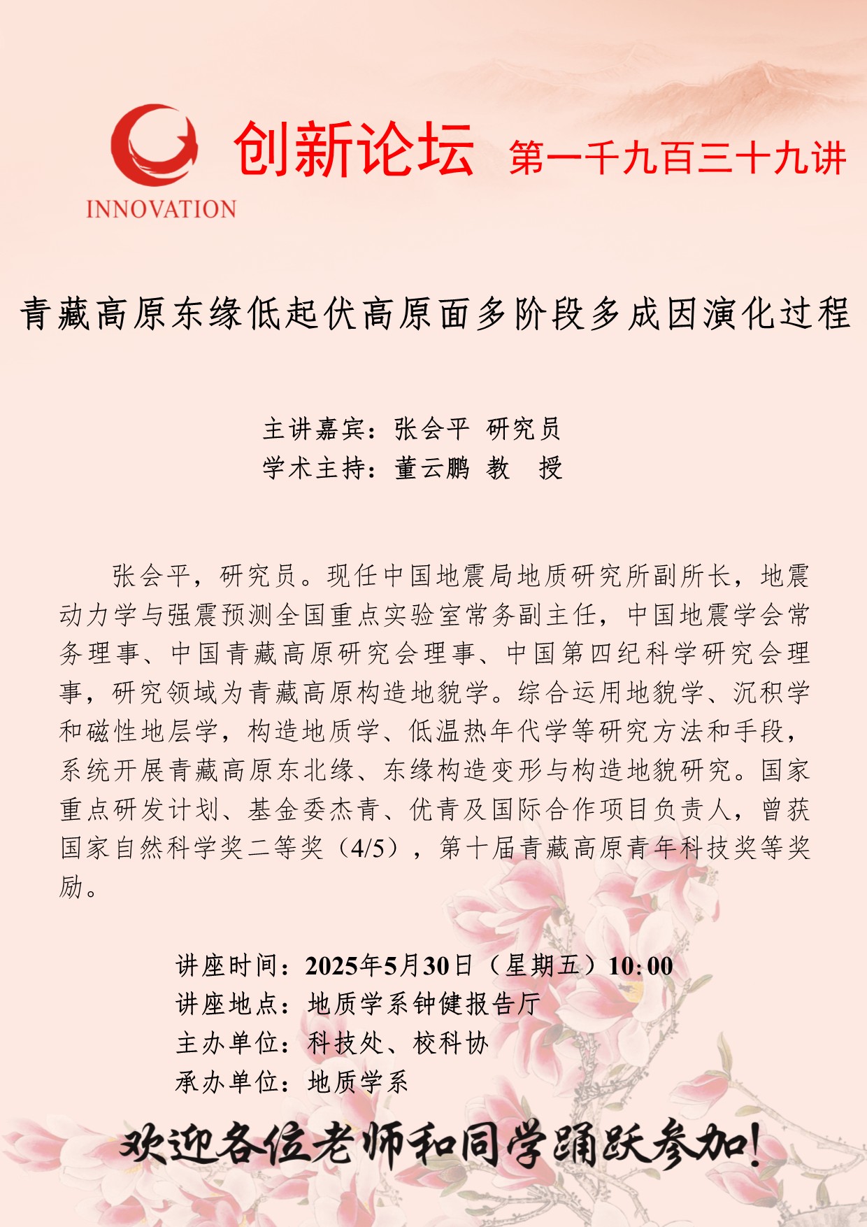 张会平 研究员 乐竞体育电竞(中国)股份有限公司官网创新论坛第一千九百三十九讲:青藏高原东缘低起伏高原面多阶段多成因演化过程 讲座时间 2025年5月30日(星期五)10:00 讲座地点 地质学系钟健报告厅 讲座人介绍 张会平 研究员 讲座内容