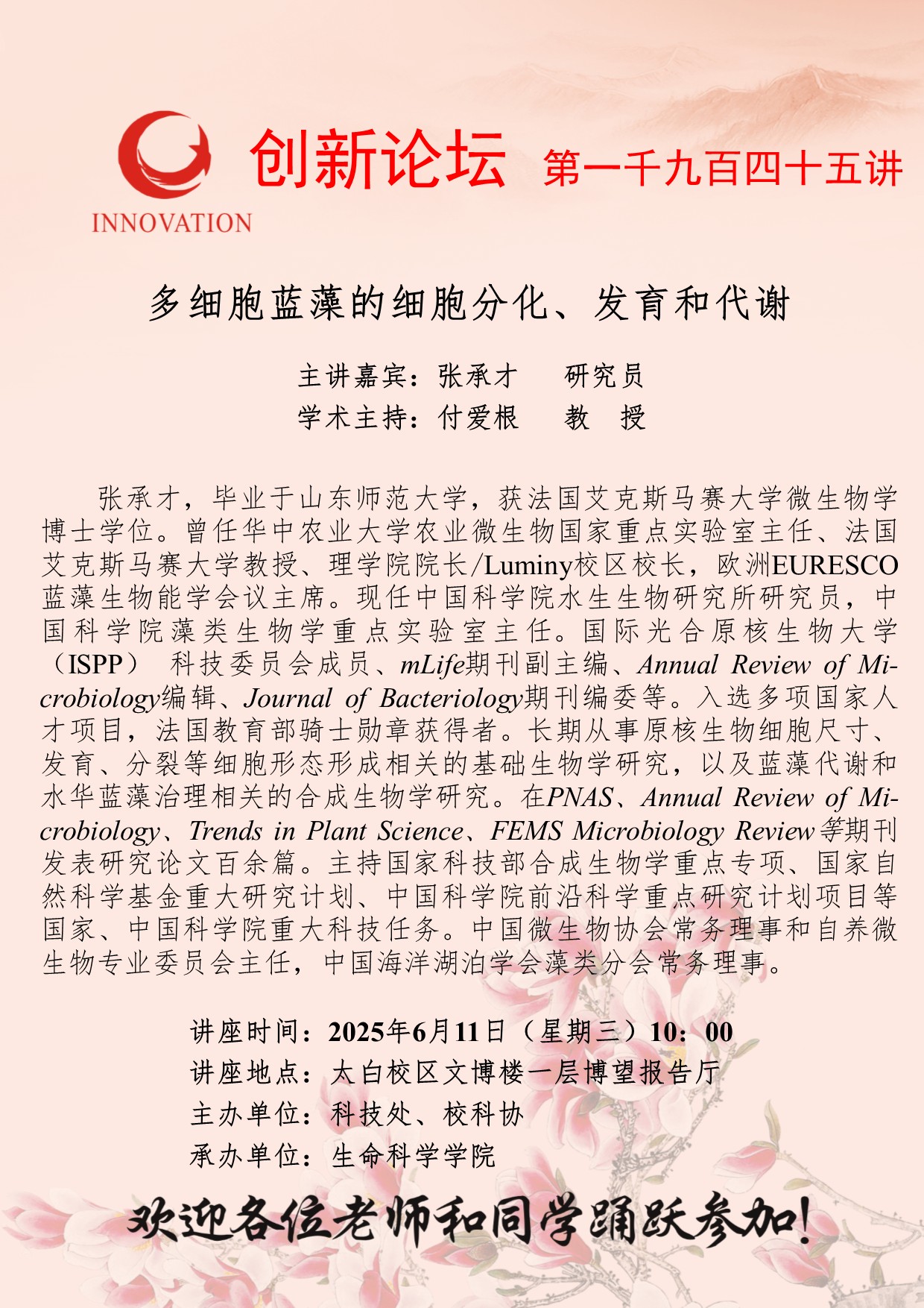 张承才 研究员 乐竞体育电竞(中国)股份有限公司官网创新论坛第一千九百四十五讲:多细胞蓝藻的细胞分化、发育和代谢 讲座时间 2025年6月11日(星期三)10:00 讲座地点 太白校区文博楼一层博望报告厅 讲座人介绍 张承才 研究员 讲座内容