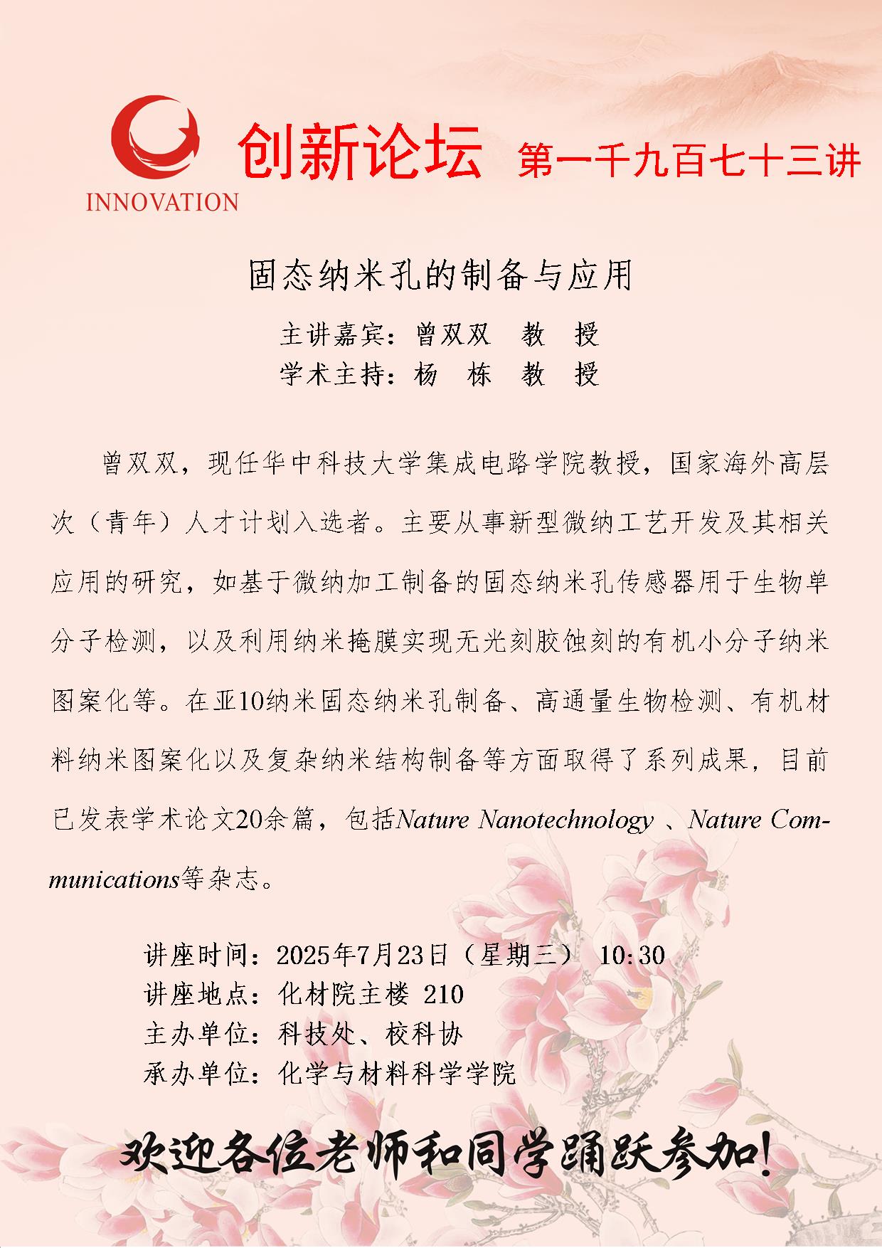 曾双双 教授 乐竞体育电竞(中国)股份有限公司官网创新论坛第一千九百七十三讲:固态纳米孔的制备与应用 讲座时间 2025年7月23日(星期三) 10:30 讲座地点 化材院主楼 210 讲座人介绍 曾双双 教授 讲座内容