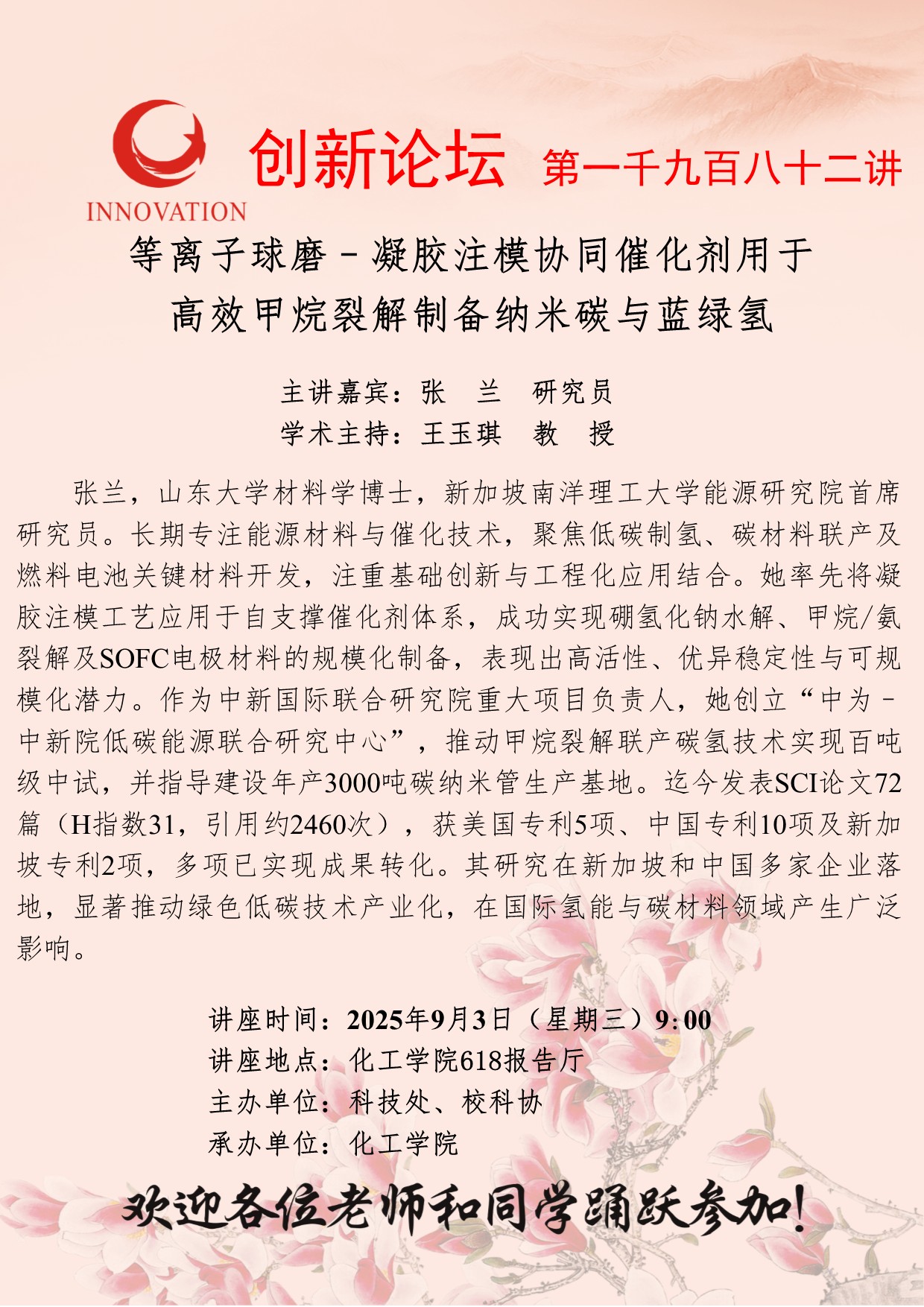张兰 研究员 乐竞体育电竞(中国)股份有限公司官网创新论坛第一千九百八十二讲:等离子球磨–凝胶注模协同催化剂用于高效甲烷裂解制备纳米碳与蓝绿氢 讲座时间 2025年9月3日(星期三)9:00 讲座地点 化工学院618报告厅 讲座人介绍 张兰 研究员 讲座内容