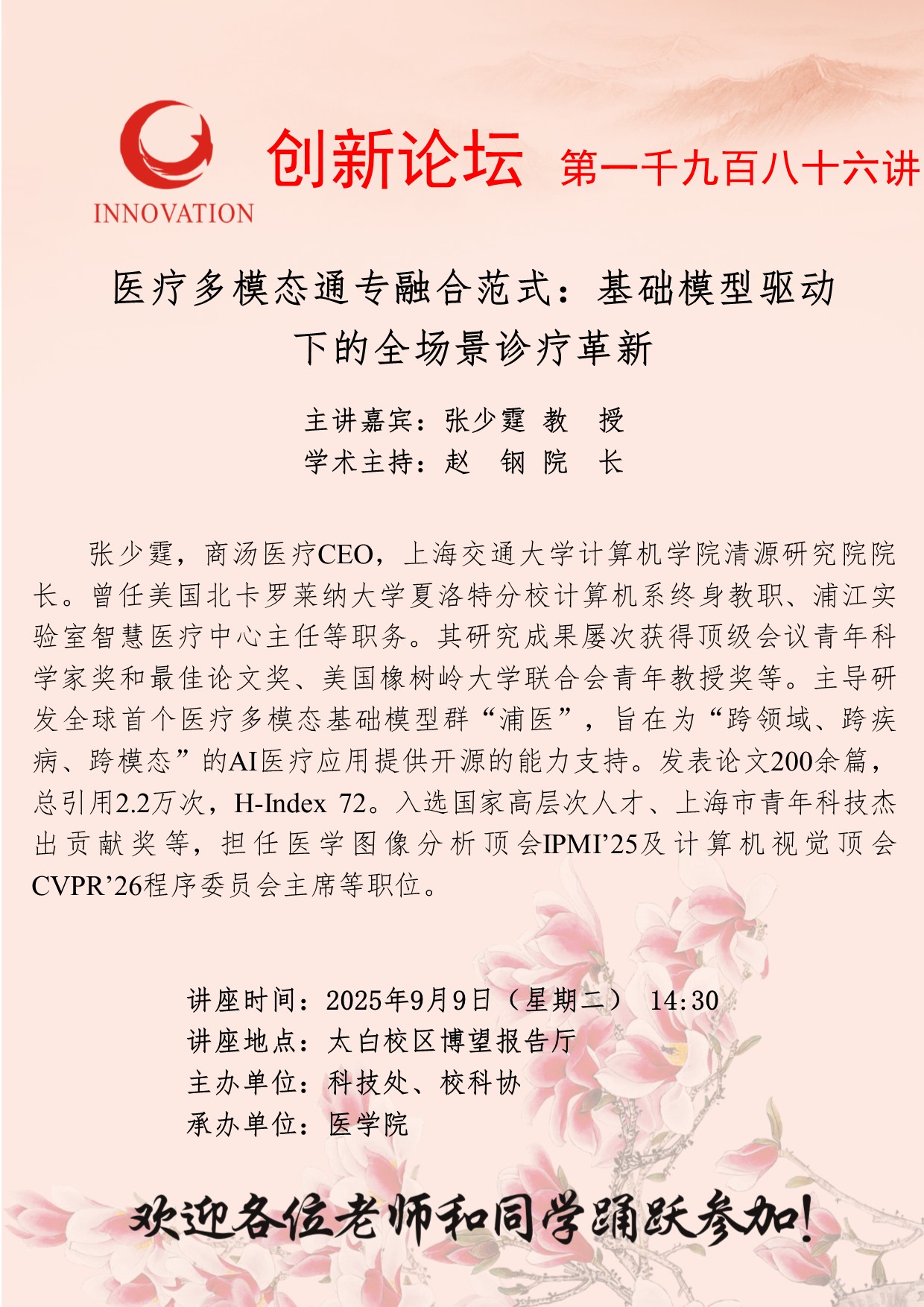 张少霆 教 授 乐竞体育电竞(中国)股份有限公司官网创新论坛第一千九百八十六讲:医疗多模态通专融合范式:基础模型驱动下的全场景诊疗革新 讲座时间 2025年9月9日(星期二) 14:30 讲座地点 太白校区博望报告厅 讲座人介绍 张少霆 教 授 讲座内容 fu