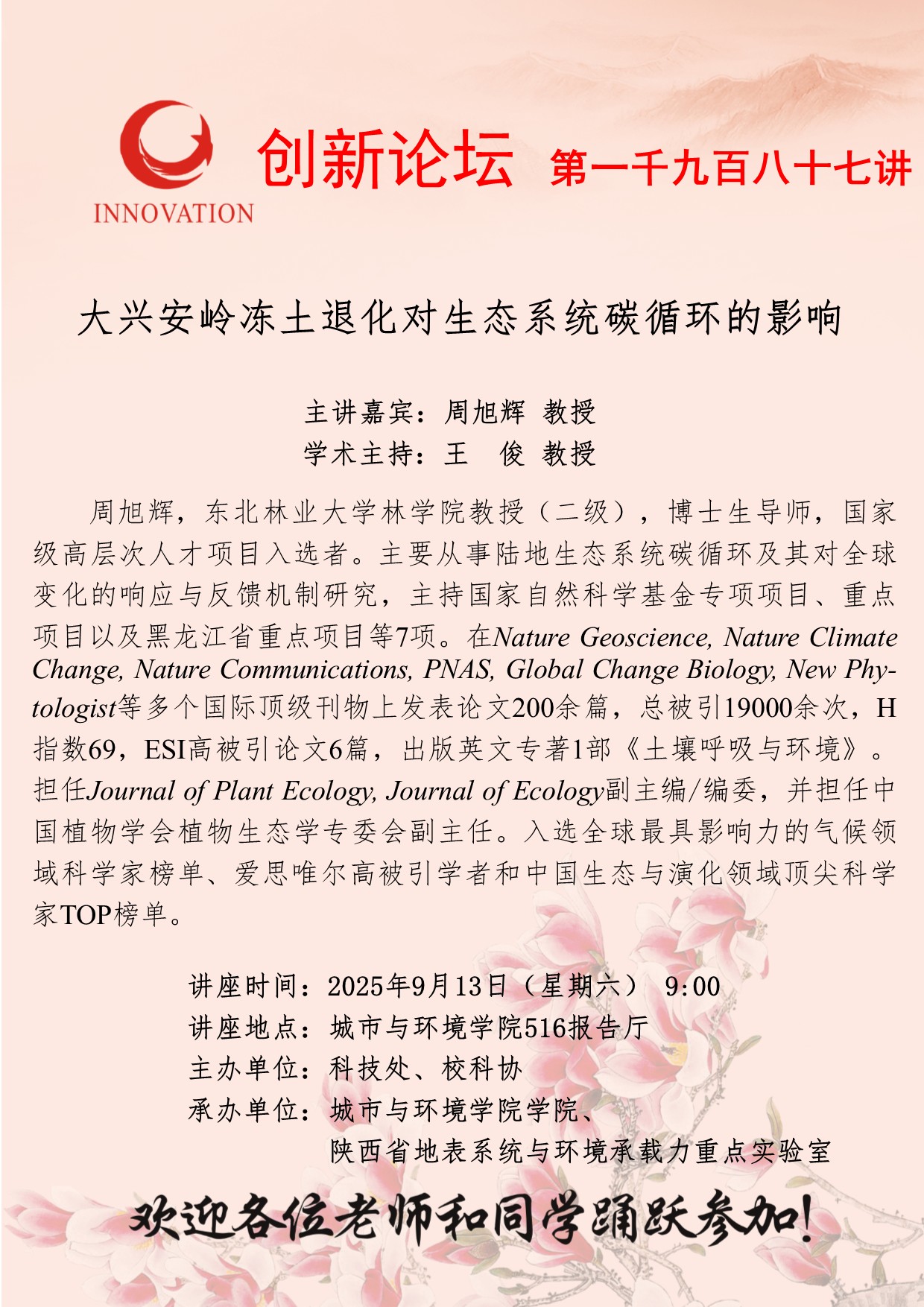 周旭辉 教授 乐竞体育电竞(中国)股份有限公司官网创新论坛第一千九百八十七讲:大兴安岭冻土退化对生态系统碳循环的影响 讲座时间 2025年9月13日(星期六) 讲座地点 城市与环境学院516报告厅 讲座人介绍 周旭辉 教授 讲座内容