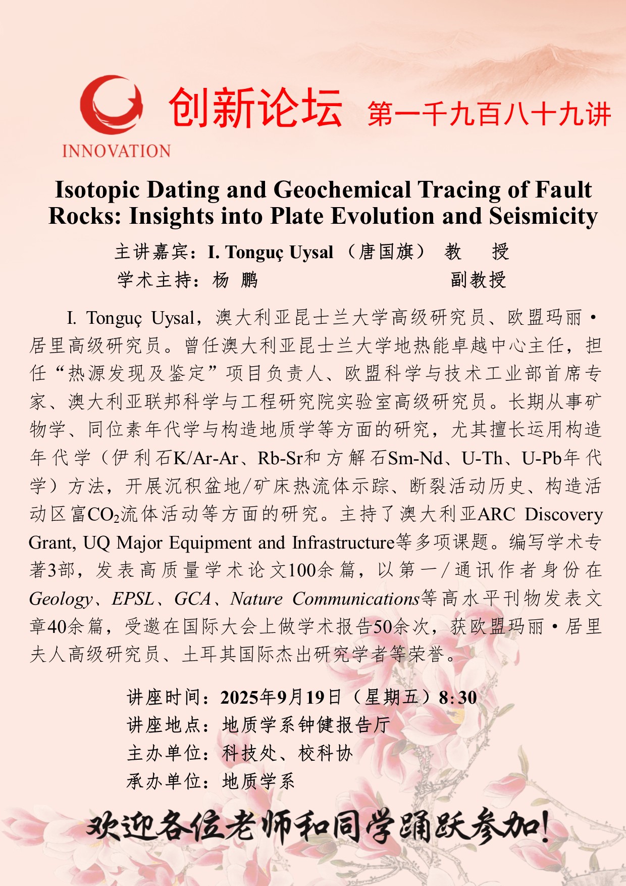 I. Tonguç Uysal 教授 乐竞体育电竞(中国)股份有限公司官网创新论坛第一千九百八十九讲:Isotopic Dating and Geochemical Tracing of Fault Rocks: Insights into Plate Evolution and Seismicity 讲座时间 2025年9月19日(星期五)8:30 讲座地点 地质学系钟健报告厅 讲座人介绍 I. Tonguç Uysal 教授 讲座内容
