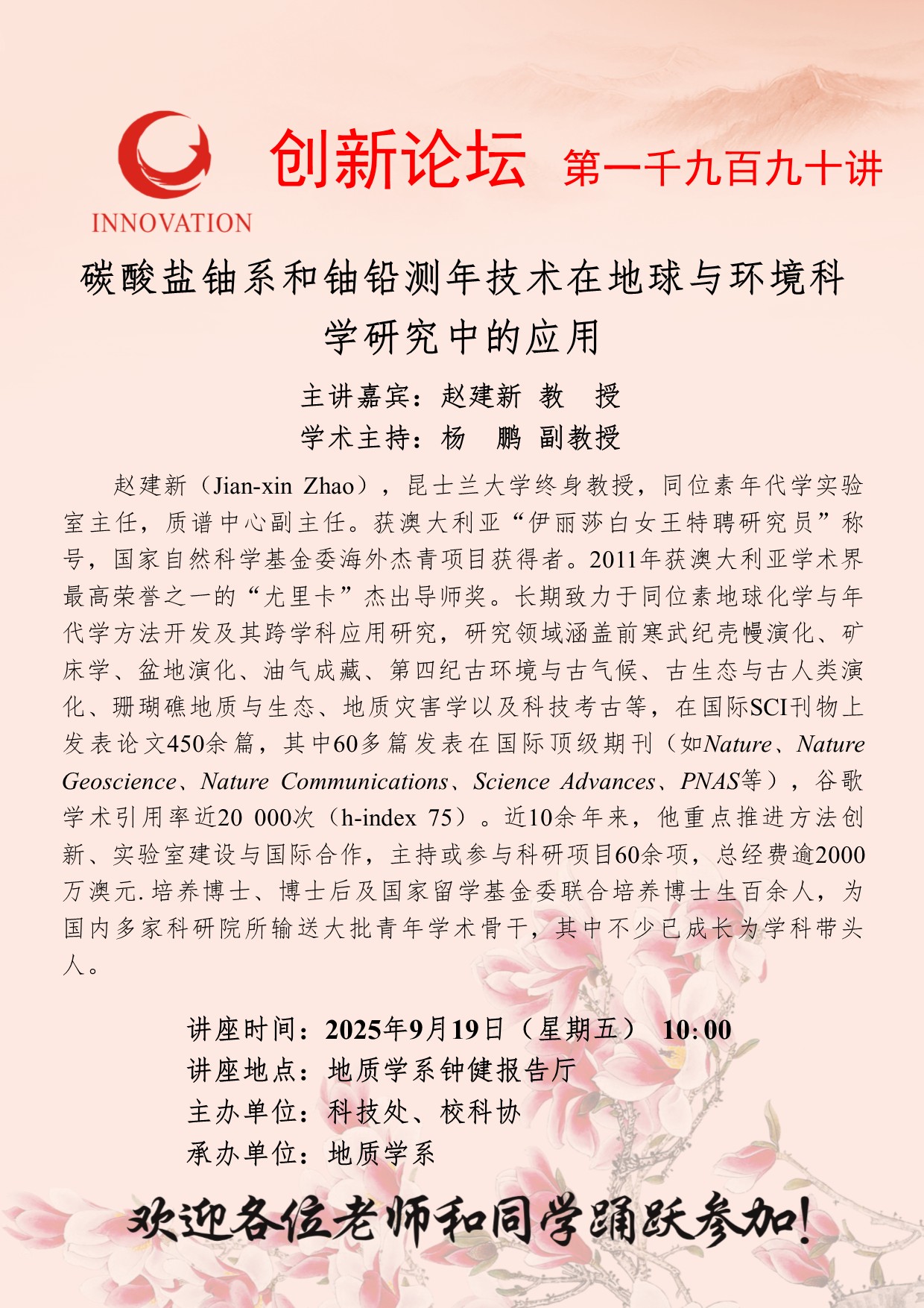 赵建新 教授 乐竞体育电竞(中国)股份有限公司官网创新论坛第一千九百九十讲:碳酸盐铀系和铀铅测年技术在地球与环境科学研究中的应用 讲座时间 2025年9月19日(星期五) 10:00 讲座地点 地质学系钟健报告厅 讲座人介绍 赵建新 教授 讲座内容