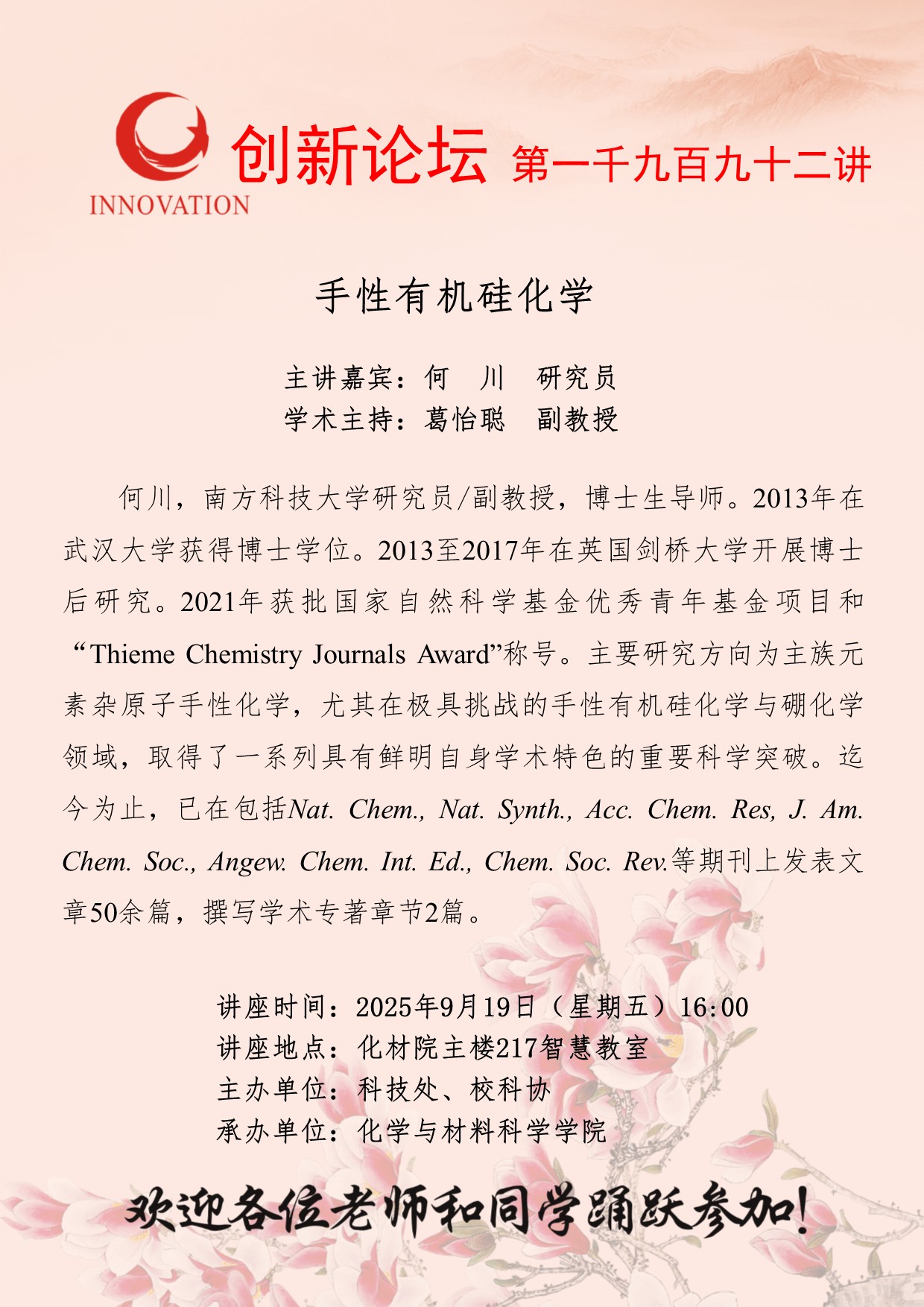 何川 研究员 乐竞体育电竞(中国)股份有限公司官网创新论坛第一千九百九十二讲:手性有机硅化学 讲座时间 2025年9月19日(星期五)16:00 讲座地点 化材院主楼217智慧教室 讲座人介绍 何川 研究员 讲座内容