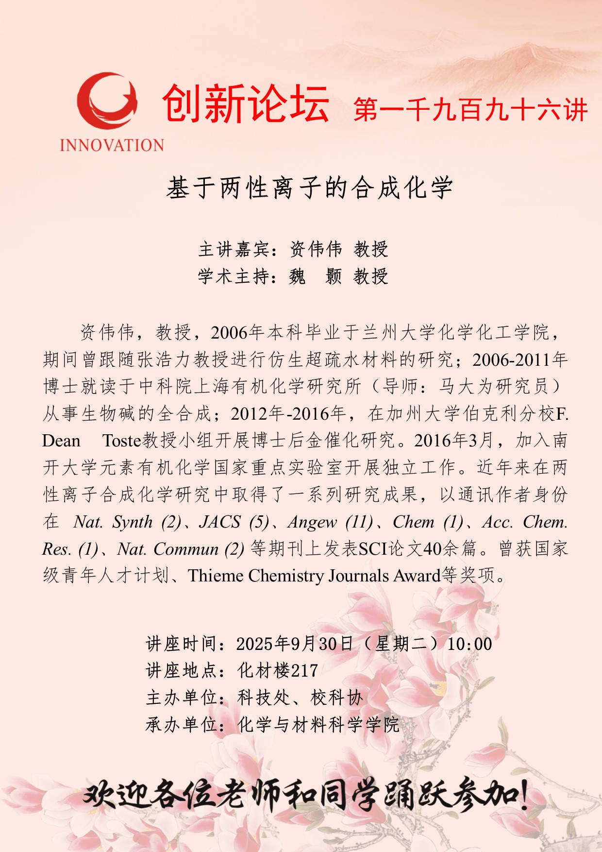 资伟伟 教授 乐竞体育电竞(中国)股份有限公司官网创新论坛第一千九百九十六讲: 基于两性离子的合成化学 讲座时间 2025年9月30日(星期二)10:00 讲座地点 化材楼217 讲座人介绍 资伟伟 教授 讲座内容
