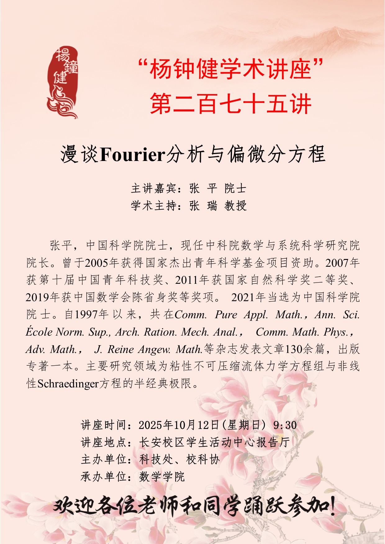 张平 院士 “杨钟健学术讲座”第二百七十五讲:漫谈Fourier分析与偏微分方程 讲座时间 2025年10月12日(星期日) 9:30 讲座地点 长安校区学生活动中心报告厅 讲座人介绍 张平 院士 讲座内容