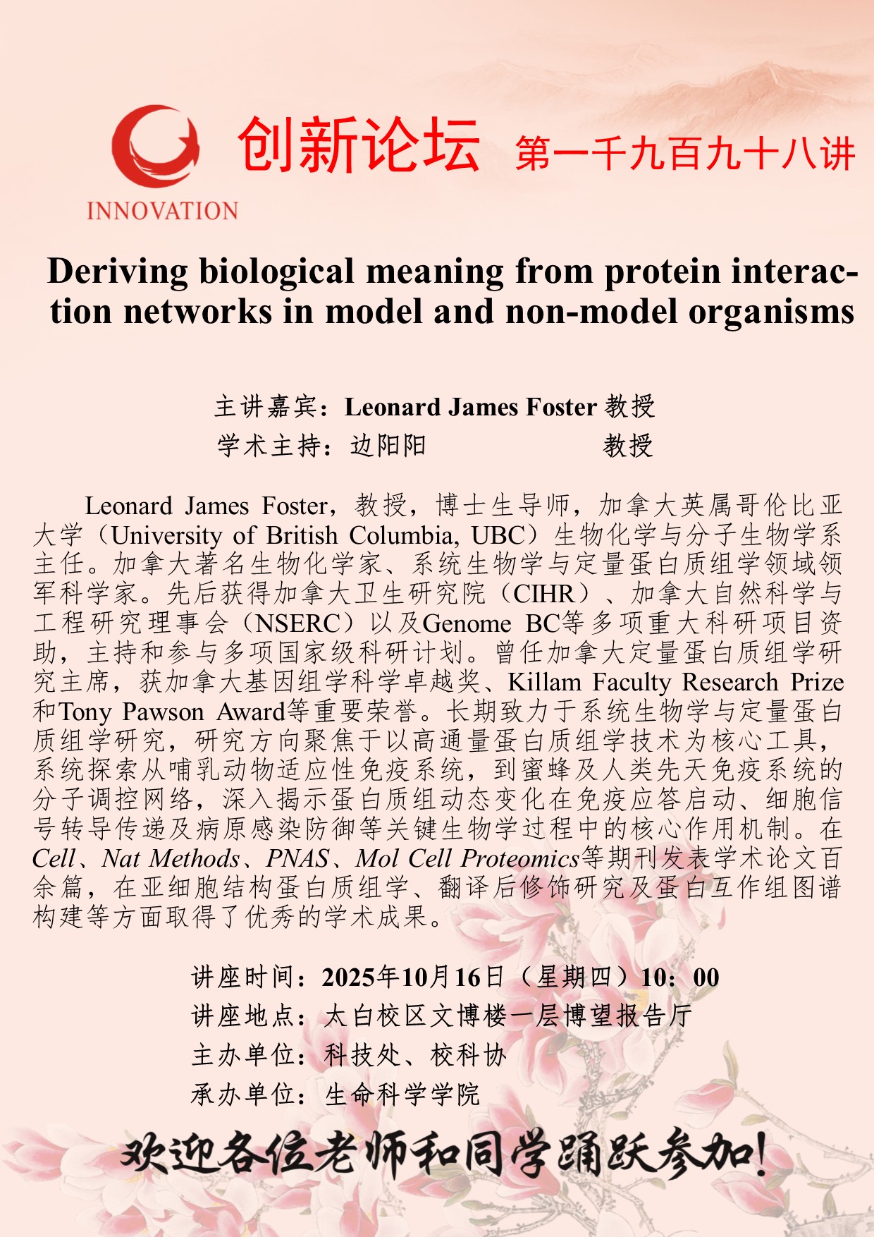 Leonard James Foster 教授 乐竞体育电竞(中国)股份有限公司官网创新论坛第一千九百九十八讲:Deriving biological meaning from protein interaction networks in model and non-model organisms 讲座时间 2025年10月16日(星期四)10:00 讲座地点 太白校区文博楼一层博望报告厅 讲座人介绍 Leonard James Foster 教授 讲座内容