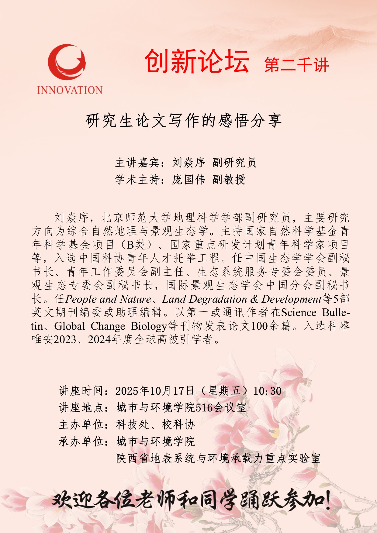 刘焱序 副研究员 乐竞体育电竞(中国)股份有限公司官网创新论坛第二千讲:研究生论文写作的感悟分享 讲座时间 2025年10月17日(星期五)10:30 讲座地点 城市与环境学院516会议室 讲座人介绍 刘焱序 副研究员 讲座内容