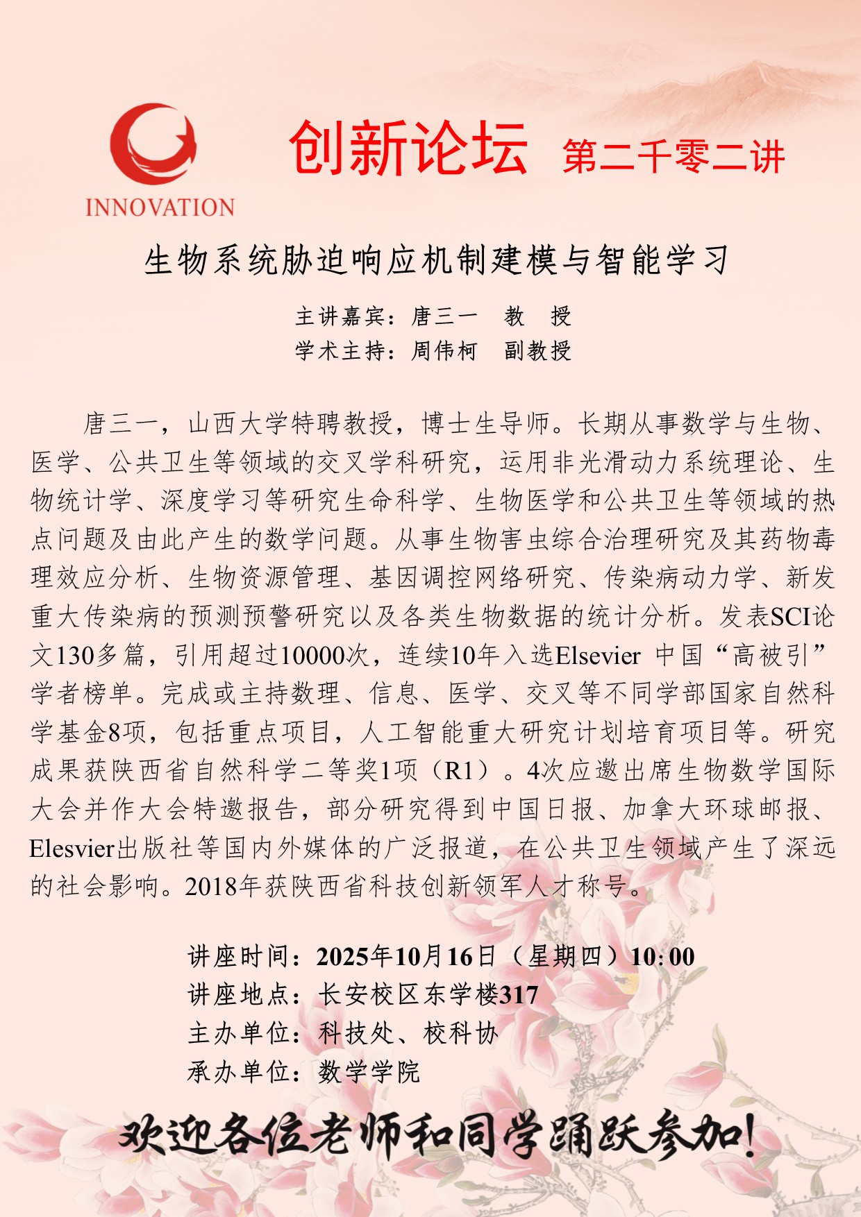 唐三一 教授 乐竞体育电竞(中国)股份有限公司官网创新论坛第二千零二讲:生物系统胁迫响应机制建模与智能学习 讲座时间 2025年10月16日(星期四)10:00 讲座地点 长安校区东学楼317 讲座人介绍 唐三一 教授 讲座内容