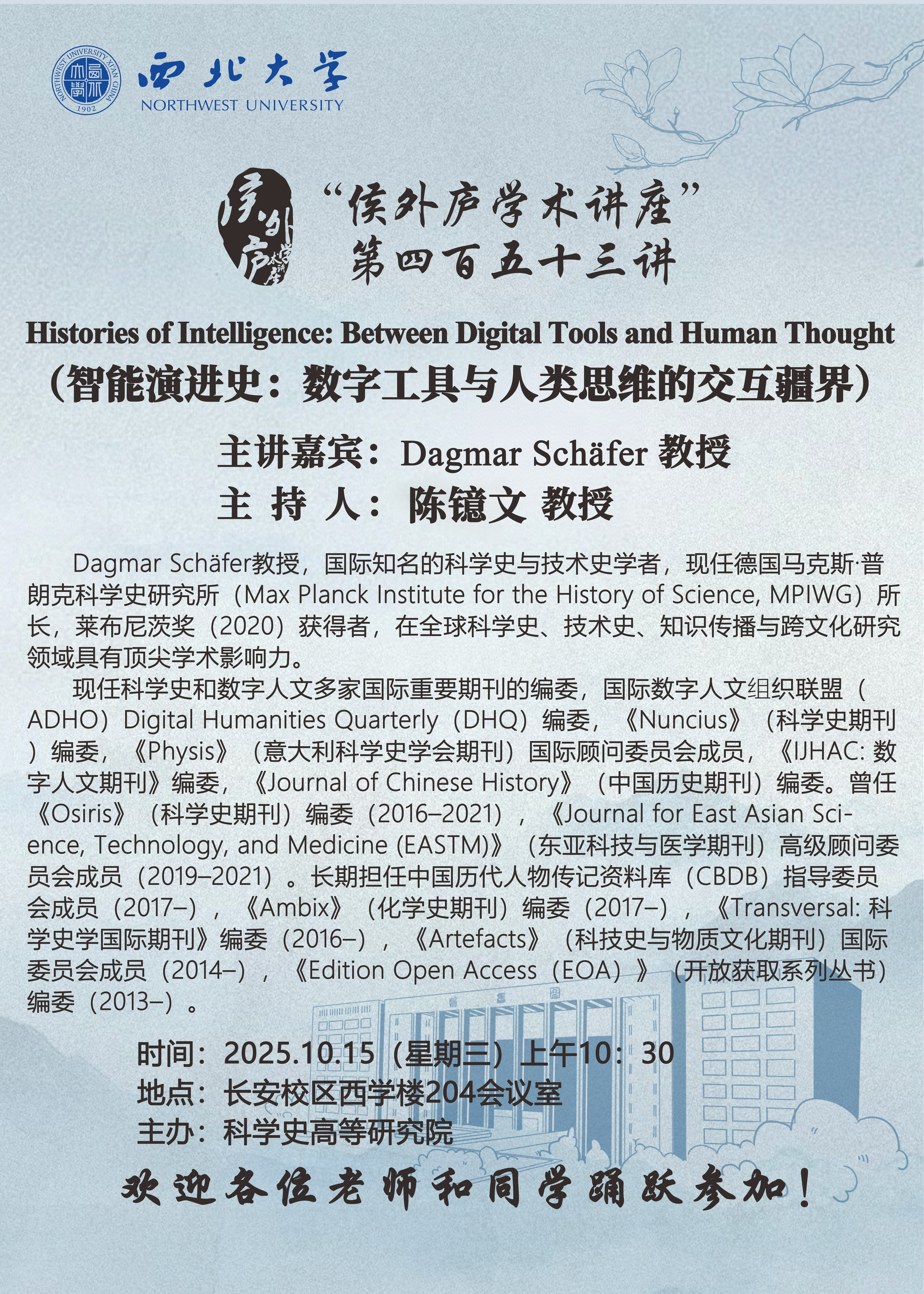 “侯外庐学术讲座”第四百五十三讲:Histories of Intelligence: Between Digital Tools and Human Thought(智能演进史:数字工具与人类思维的交互疆界)