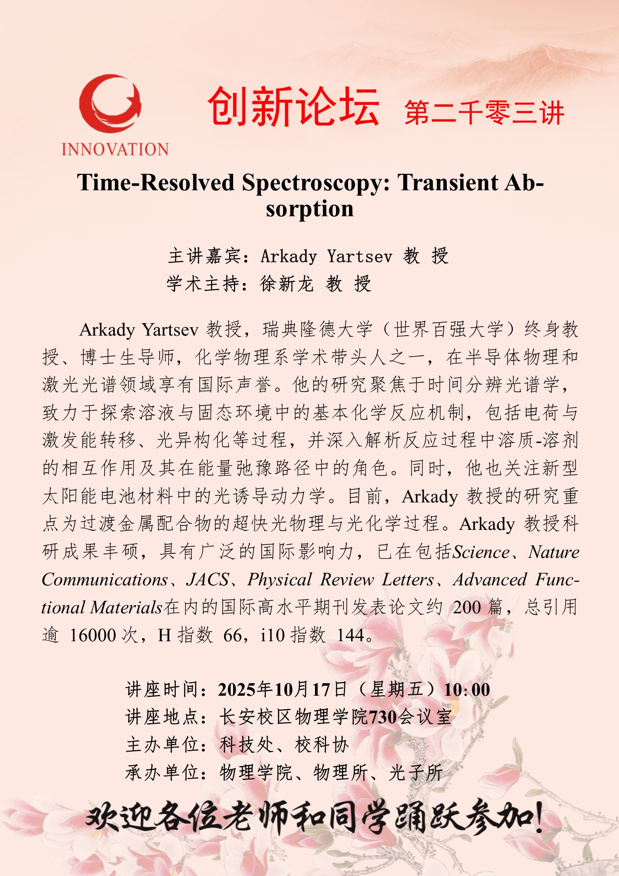 Arkady Yartsev 教授 乐竞体育电竞(中国)股份有限公司官网创新论坛第二千零三讲:Time-Resolved Spectroscopy: Transient Absorption 讲座时间 2025年10月17日(星期五)10:00 讲座地点 长安校区物理学院730会议室 讲座人介绍 Arkady Yartsev 教授 讲座内容