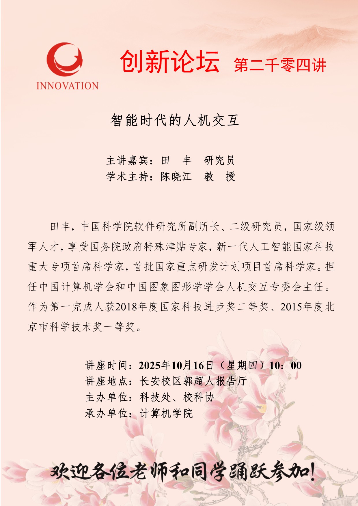 田丰 研究员 乐竞体育电竞(中国)股份有限公司官网创新论坛第二千零四讲:智能时代的人机交互 讲座时间 2025年10月16日(星期四)10:00 讲座地点 长安校区郭超人报告厅 讲座人介绍 田丰 研究员 讲座内容