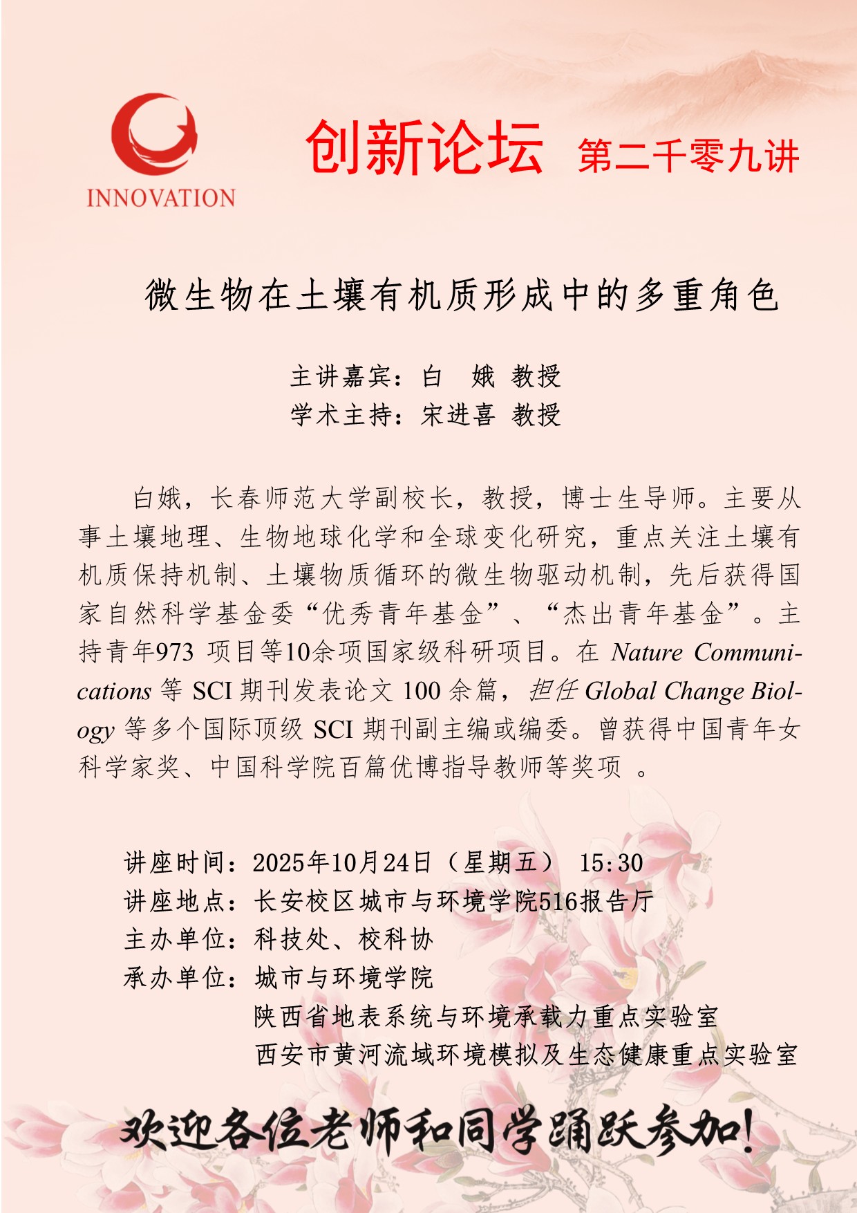 白娥 教授 乐竞体育电竞(中国)股份有限公司官网创新论坛第二千零九讲:微生物在土壤有机质形成中的多重角色 讲座时间 2025年10月24日(星期五) 15:30 讲座地点 长安校区城市与环境学院516报告厅 讲座人介绍 白娥 教授 讲座内容
