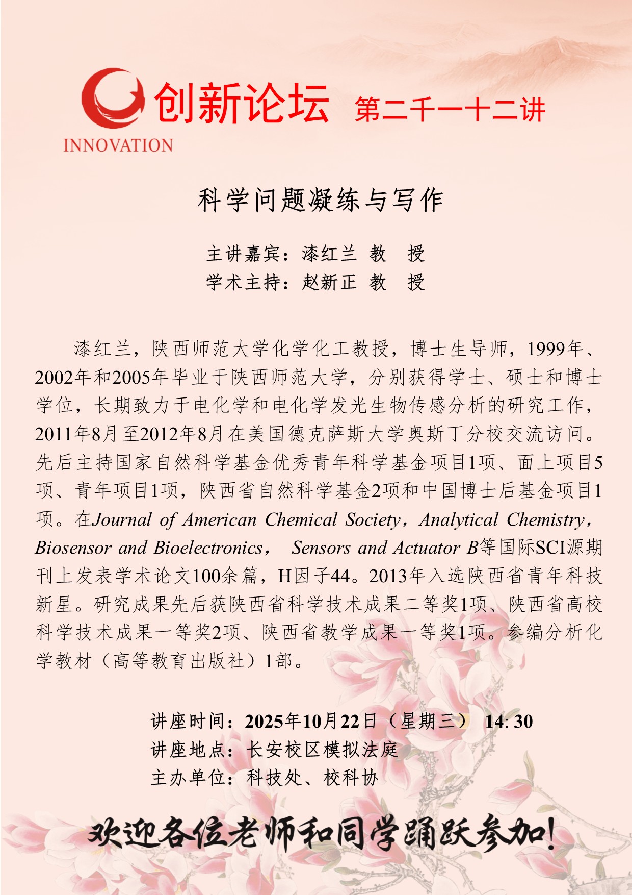漆红兰 教 授 乐竞体育电竞(中国)股份有限公司官网创新论坛第二千一十二讲:科学问题凝练与写作 讲座时间 2025年10月22日(星期三) 14: 30 讲座地点 长安校区模拟法庭 讲座人介绍 漆红兰 教 授 讲座内容