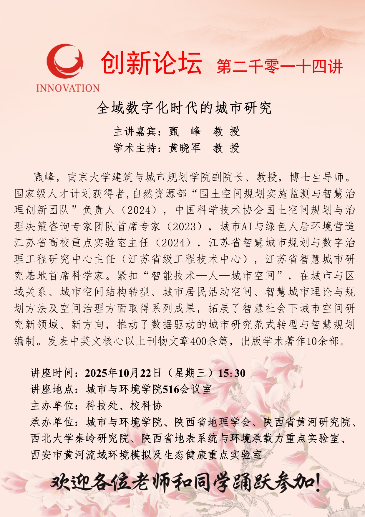 甄峰 教授 乐竞体育电竞(中国)股份有限公司官网创新论坛第二千零一十四讲:全域数字化时代的城市研究 讲座时间 2025年10月22日(星期三)15:30 讲座地点 城市与环境学院516会议室 讲座人介绍 甄峰 教授 讲座内容