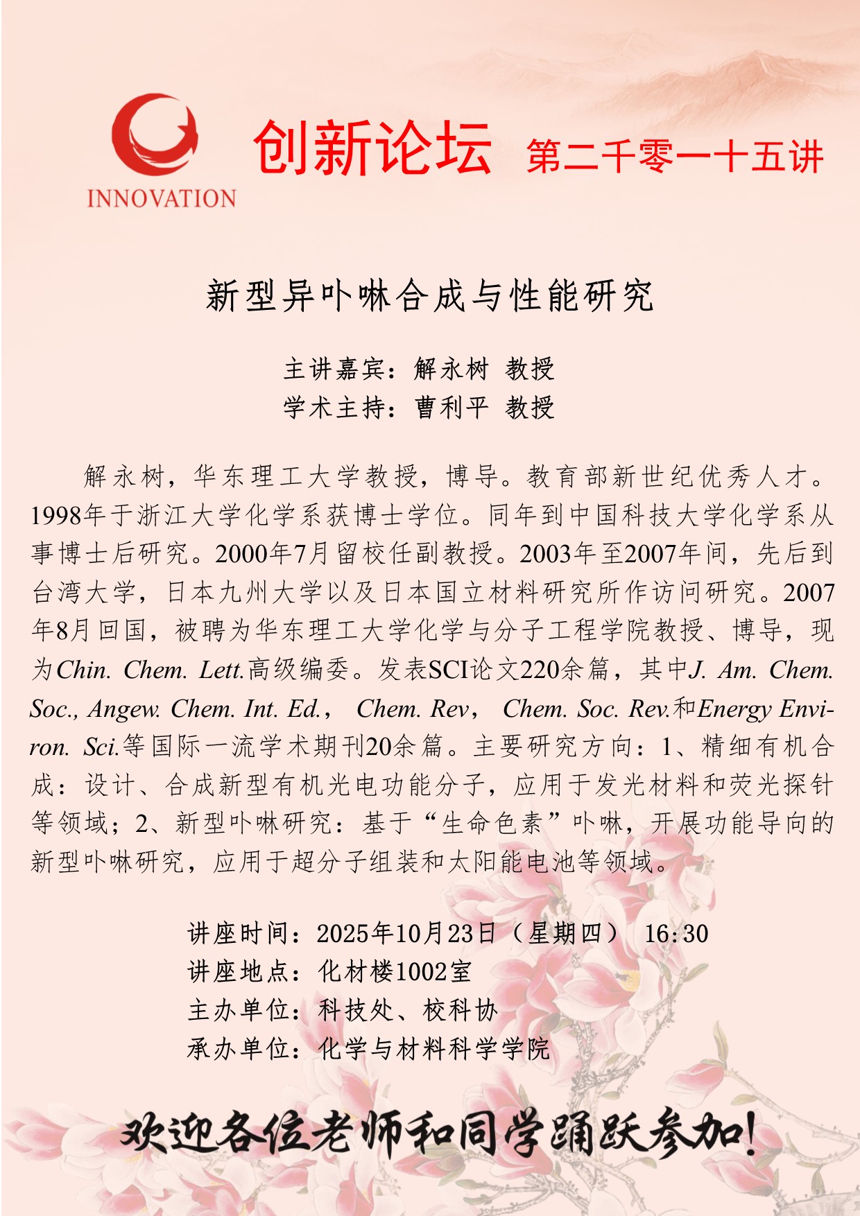 解永树 教授 乐竞体育电竞(中国)股份有限公司官网创新论坛第二千零一十五讲:新型异卟啉合成与性能研究 讲座时间 2025年10月23日(星期四) 16:30 讲座地点 化材楼1002室 讲座人介绍 解永树 教授 讲座内容