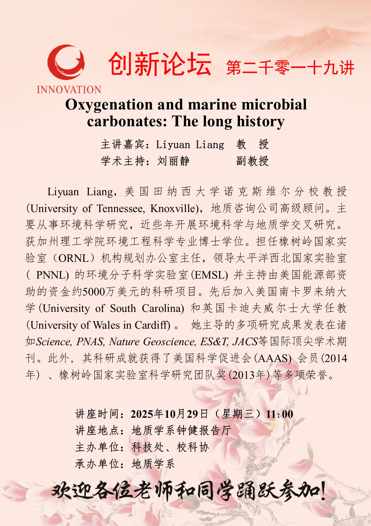 Liyuan Liang 教授 乐竞体育电竞(中国)股份有限公司官网创新论坛第二千零一十九讲:Oxygenation and marine microbial carbonates: The long history 讲座时间 2025年10月29日(星期三)11:00 讲座地点 地质学系钟健报告厅 讲座人介绍 Liyuan Liang 教授 讲座内容