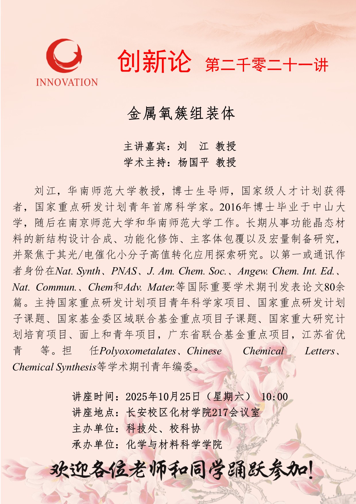 刘 江 教授 乐竞体育电竞(中国)股份有限公司官网创新论坛第二千零二十一讲:金属氧簇组装体 讲座时间 2025年10月25日(星期六) 10:00 讲座地点 长安校区化材学院217会议室 讲座人介绍 刘 江 教授 讲座内容