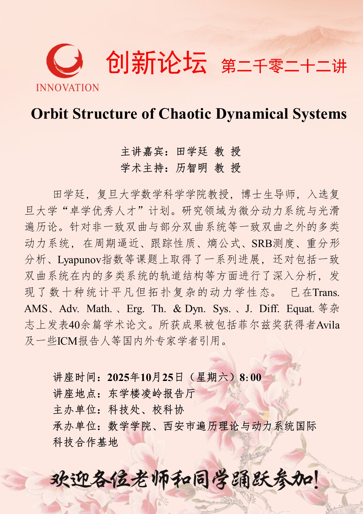 田学廷 教 授 乐竞体育电竞(中国)股份有限公司官网创新论坛第二千零二十二讲:Orbit Structure of Chaotic Dynamical Systems 讲座时间 2025年10月25日(星期六)8:00 讲座地点 东学楼凌岭报告厅 讲座人介绍 田学廷 教 授 讲座内容