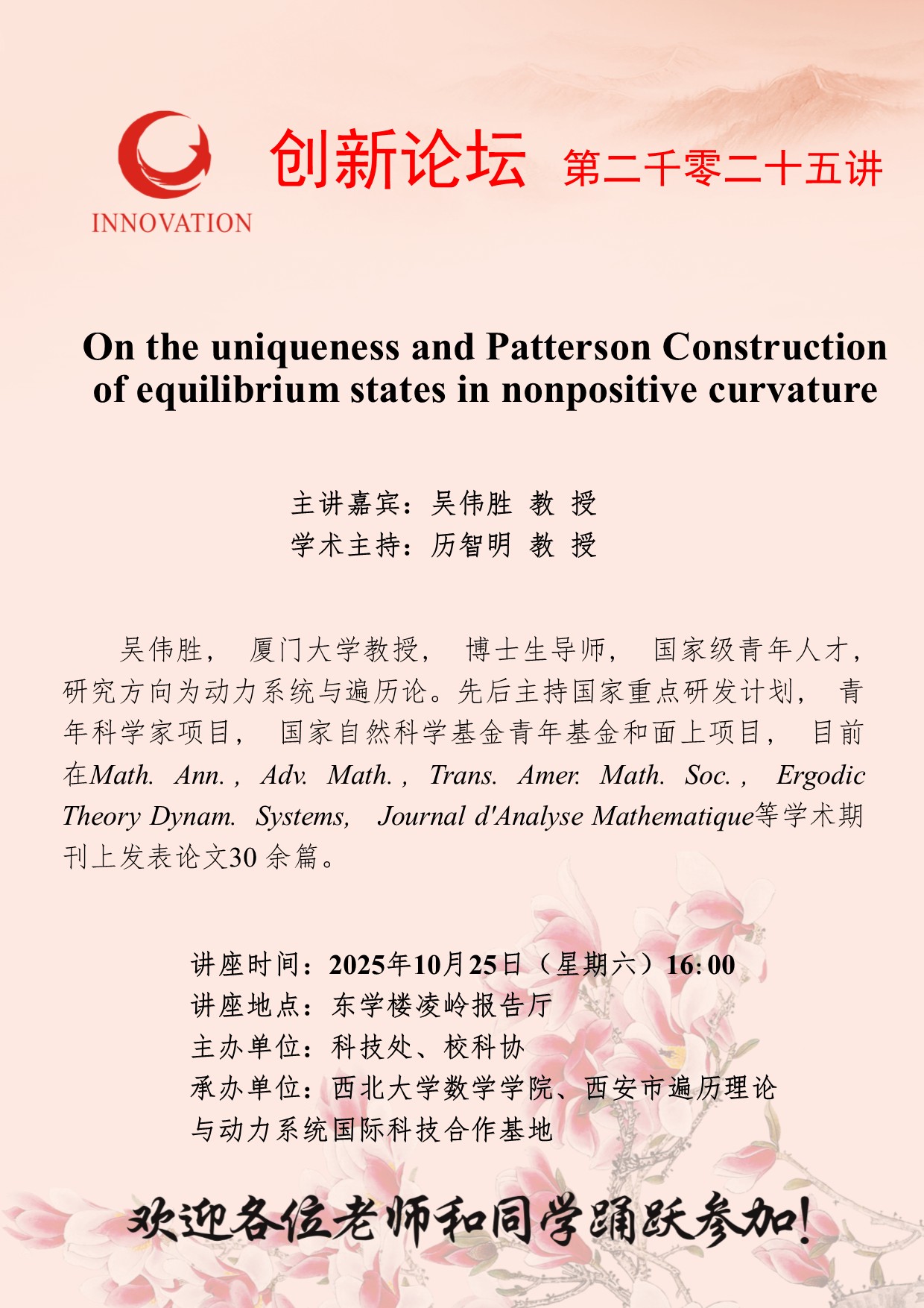 吴伟胜 教 授 乐竞体育电竞(中国)股份有限公司官网创新论坛第二千零二十五讲:On the uniqueness and Patterson Construction of equilibrium states in nonpositive curvature 讲座时间 2025年10月25日(星期六)16:00 讲座地点 东学楼凌岭报告厅 讲座人介绍 吴伟胜 教 授 讲座内容