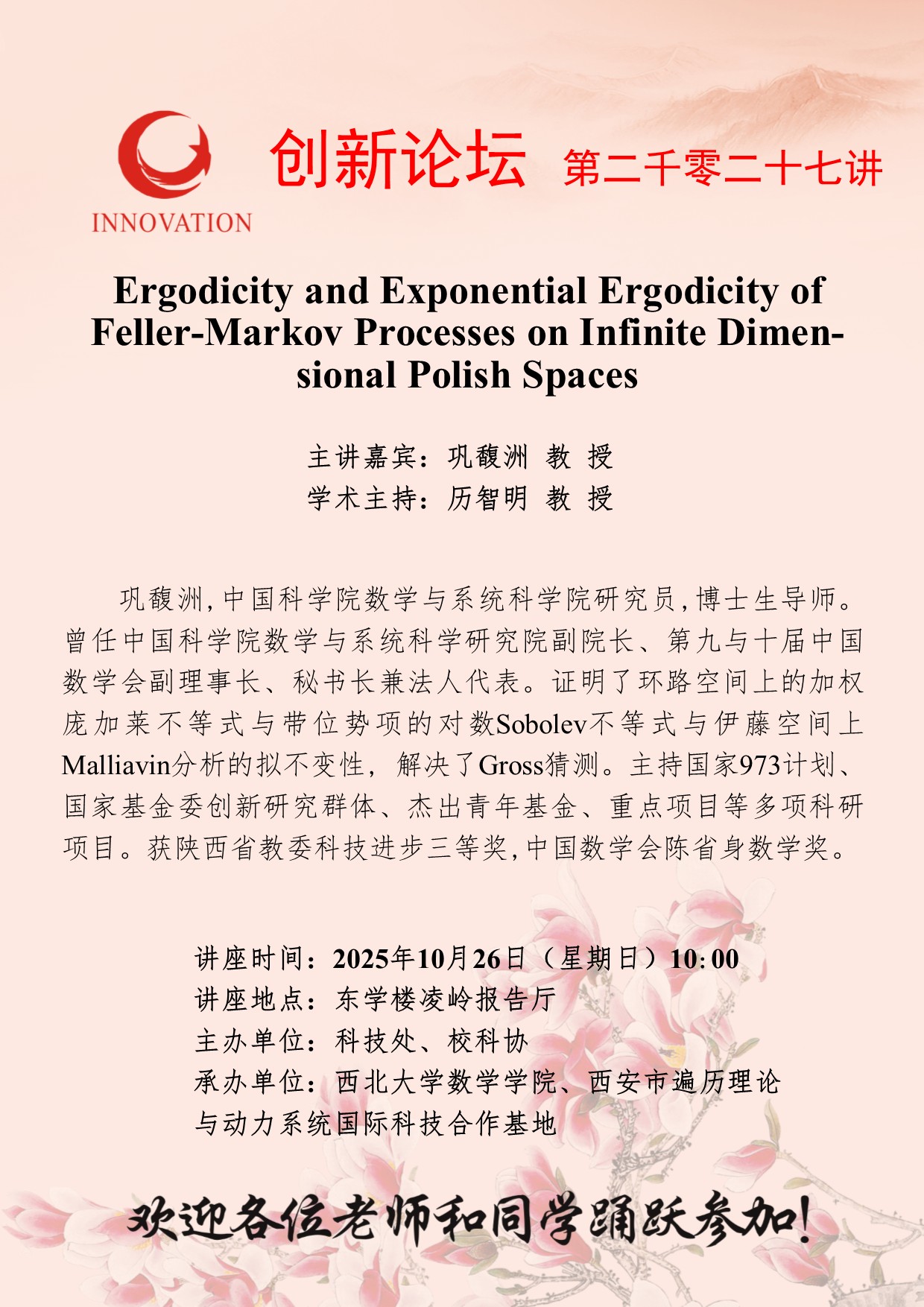 巩馥洲 教 授 乐竞体育电竞(中国)股份有限公司官网创新论坛第二千零二十七讲:Ergodicity and Exponential Ergodicity of Feller-Markov Processes on Infinite Dimensional Polish Spaces 讲座时间 2025年10月26日(星期日)10:00 讲座地点 东学楼凌岭报告厅 讲座人介绍 巩馥洲 教 授 讲座内容