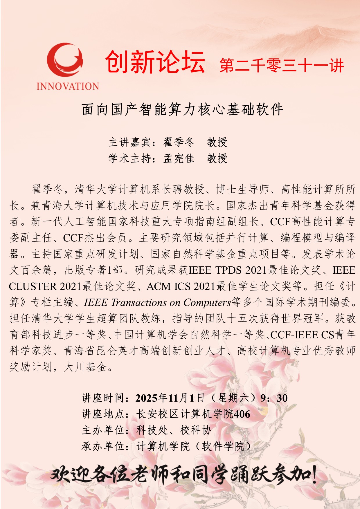 翟季冬 教授 乐竞体育电竞(中国)股份有限公司官网创新论坛第二千零三十一讲:面向国产智能算力核心基础软件 讲座时间 2025年11月1日(星期六)9:30 讲座地点 长安校区计算机学院406 讲座人介绍 翟季冬 教授 讲座内容