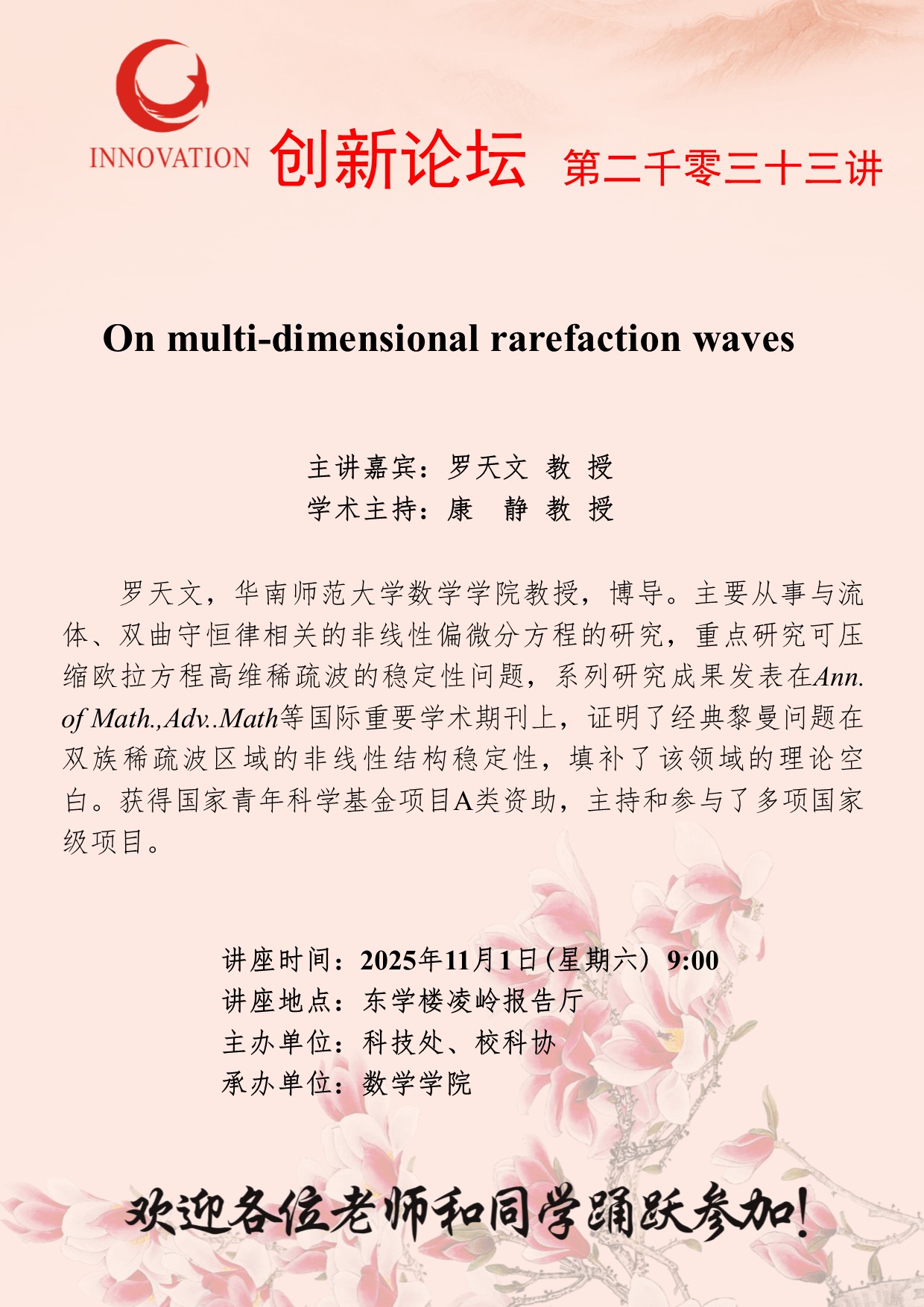 罗天文 教 授 乐竞体育电竞(中国)股份有限公司官网创新论坛第二千零三十三讲:On multi-dimensional rarefaction waves 讲座时间 2025年11月1日(星期六) 9:00 讲座地点 东学楼凌岭报告厅 讲座人介绍 罗天文 教 授 讲座内容